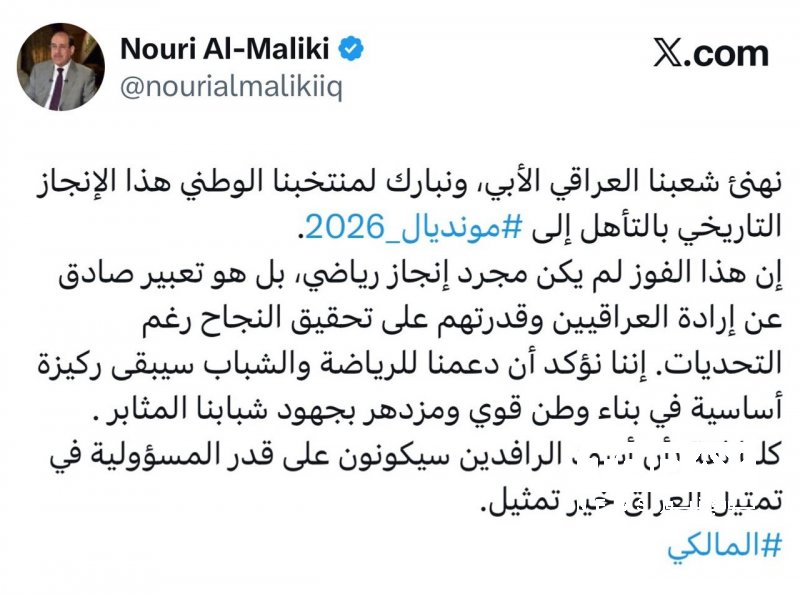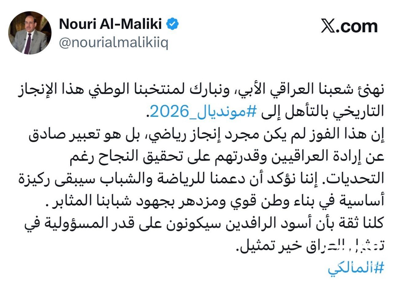 المالكي يهنئ الشعب العراقي بتأهل المنتخب الوطني الى مونديال 2026