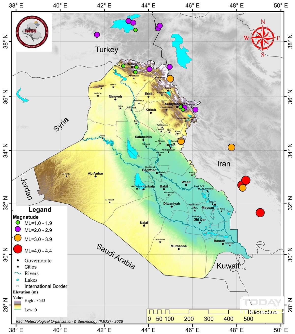 واضاف ان " (9) هزات أرضية داخل ايران (خوسيستان- كردستان– اذربيجان). بينما تم تسجيل (4) هزات داخل تركيا (فان- سيرنك) وبالقرب من حدودها مع العراق"، مشيرا اﻟﻰ ان "مقدار (قوة) الأحداث الزلزالية بين (1–4.4) درجة. في حين تراوحت أعماقها البؤرية بين (10-31) كم".