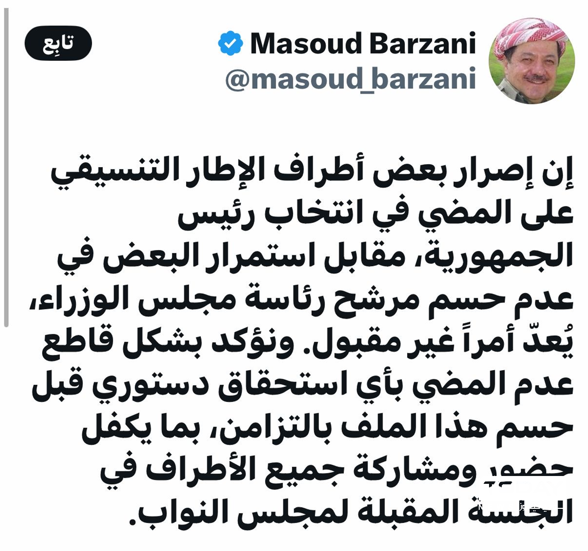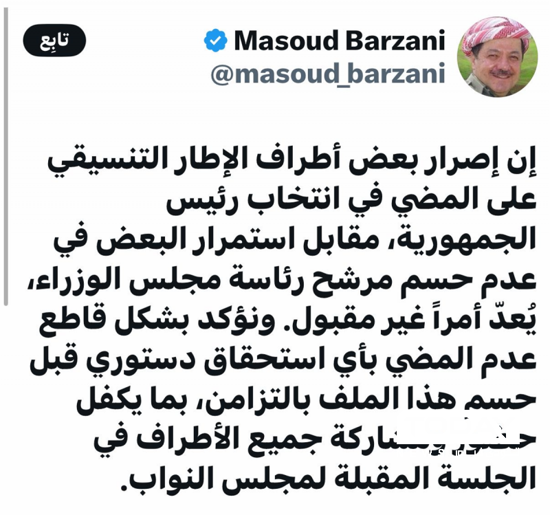 وقال بارزاني في تدوينة على منصة (X) ، ان "إصرار بعض أطراف الإطار التنسيقي على المضي في انتخاب رئيس الجمهورية، مقابل استمرار البعض في عدم حسم مرشح رئاسة مجلس الوزراء، يُعد أمراً غير مقبول".