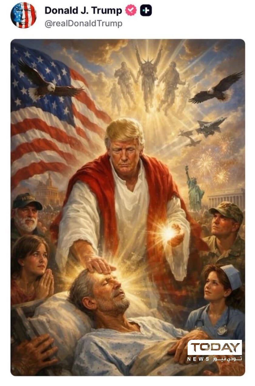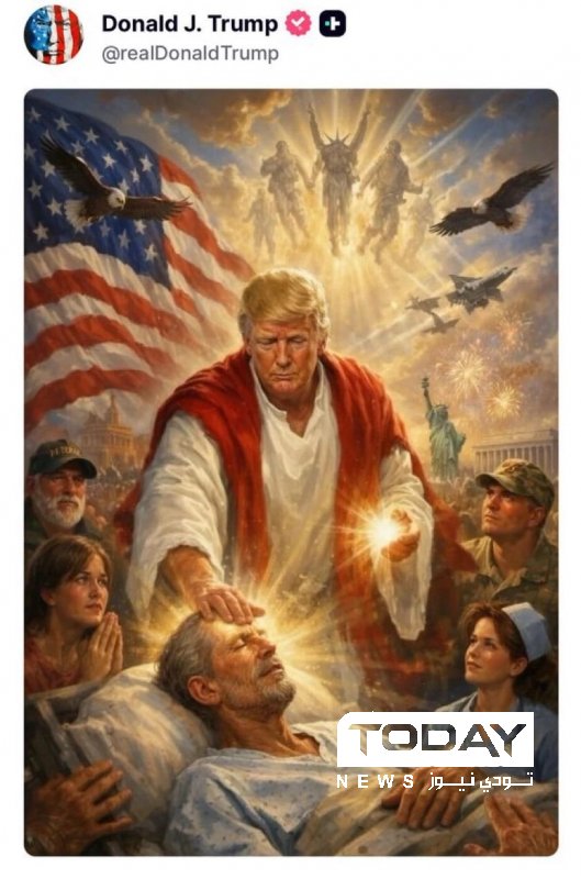 نشر الرئيس الأميركي دونالد ترمب، يوم الاثنين، على منصة "تروث سوشيال" صورة مولدة بالذكاء الاصطناعي يظهر فيها على هيئة المسيح يضع يده على شخص مريض ليشفيه.