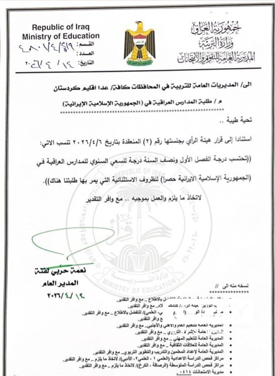 أقرّت وزارة التربية، اليوم الثلاثاء، إجراءات استثنائية لدعم طلبة المدارس العراقية في إيران.