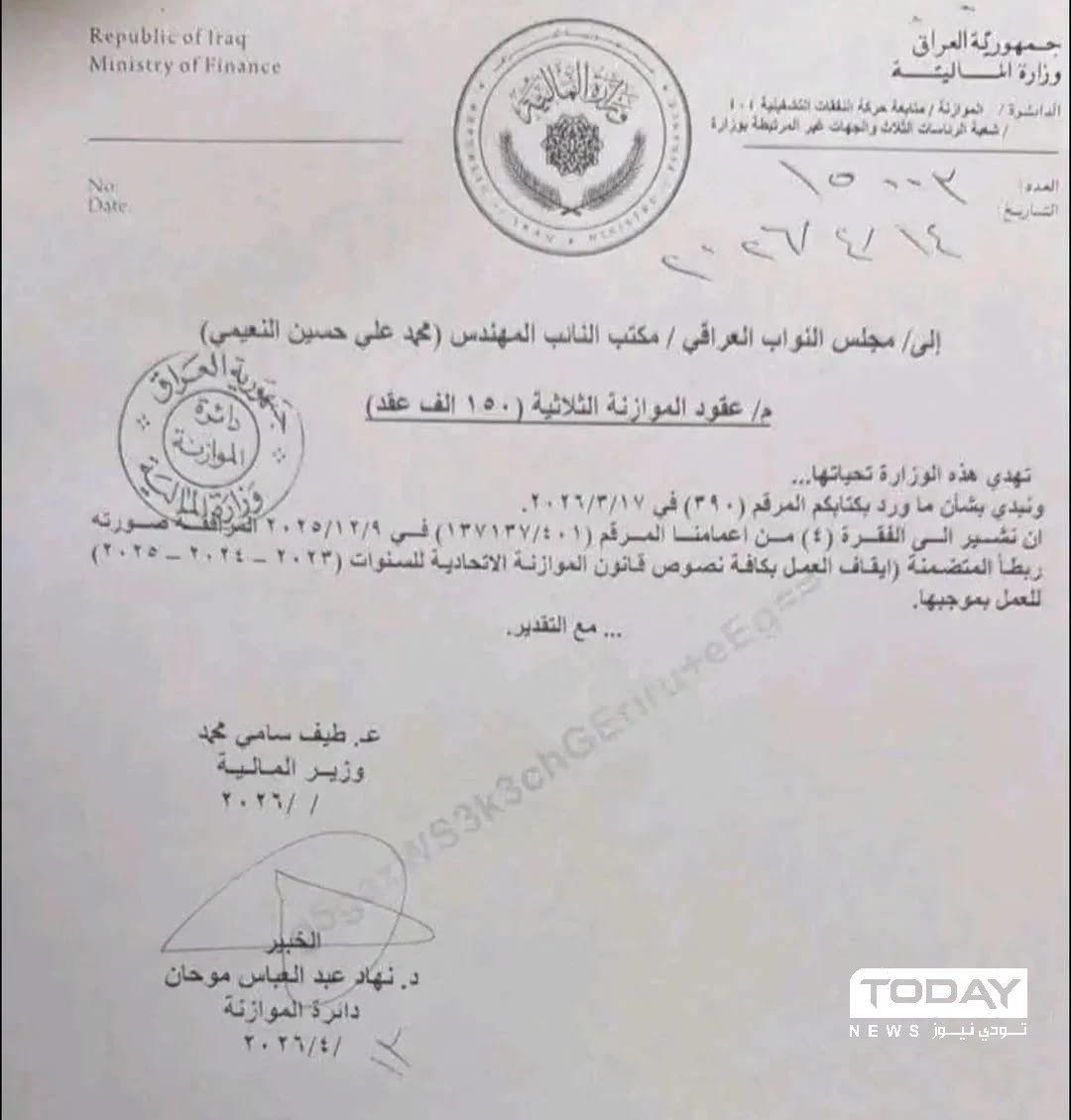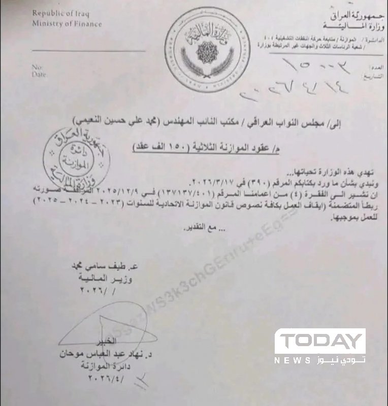 أظهرت وثيقة صادرة عن وزارة المالية العراقية، يوم الأحد، توجيهاً بإيقاف العمل بعقود "الموازنة الثلاثية" الخاصة بـ(150 ألف درجة وظيفية)، وإعادة ربطها بأحكام قانون الموازنة الاتحادية.