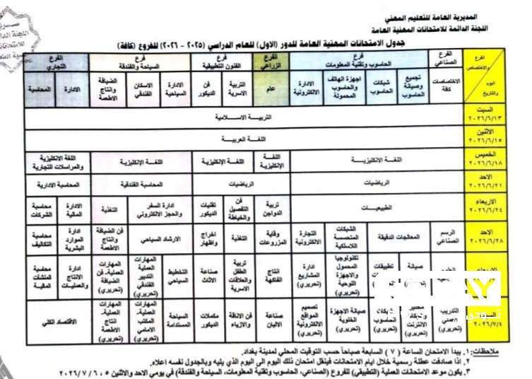 أعلنت وزارة التربية، اليوم الأحد، جدول الامتحانات المهنية العامة للدور الأول للعام الدراسي 2025–2026، لجميع الاختصاصات.