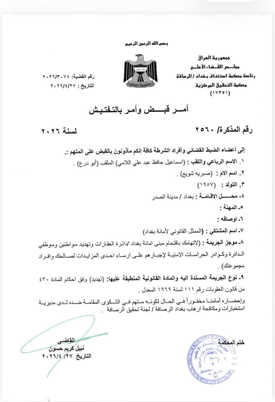 ووفقا للوثيقة فان "موجز الجريمة يتضمن الاتهام باقتحام مبنى امانة بغداد /دائرة العقارات وتهديد مواطنين وموظفي الدائرة وكوادر الحراسات الامنية لإجبارهم على ارساء احدى المزايدات لصالحه وافراد مجموعته) ".