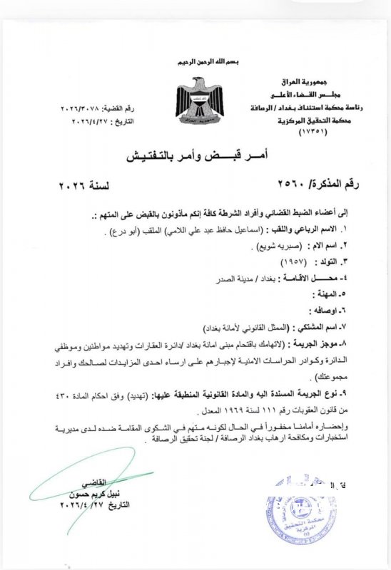أصدر مجلس القضاء الأعلى، اليوم الثلاثاء، مذكرة قبض بحق اسماعيل اللامي الملقب بـ(ابو درع).