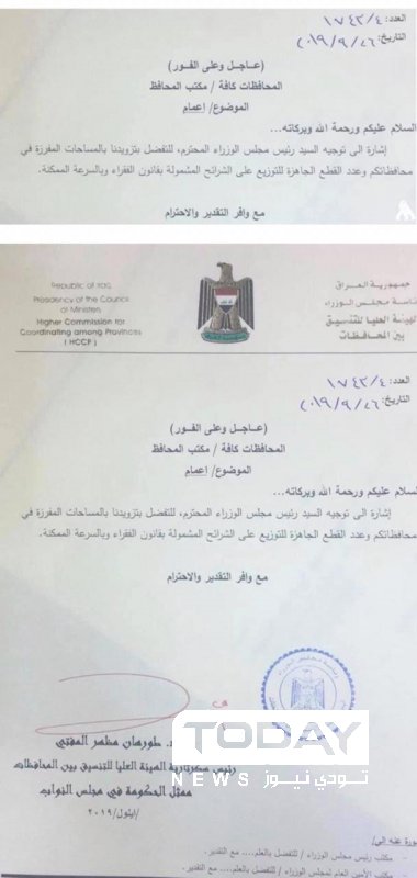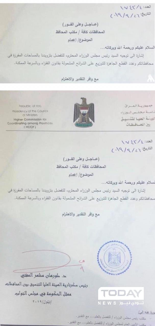وبحسب الوثيقة الصادرة من رئيس سكرتارية الهيئة طورهان مظهر الفتي، أنه "اشارة الى توجيه رئيس الوزراء، للتفضل بتزويدنا بالمساحات الفارغة في محافظاتكم وعدد القطع الجاهزة للتوزيع على الشرائح المشمولة بقانون الفقراء وبالسرعة الممكنة".