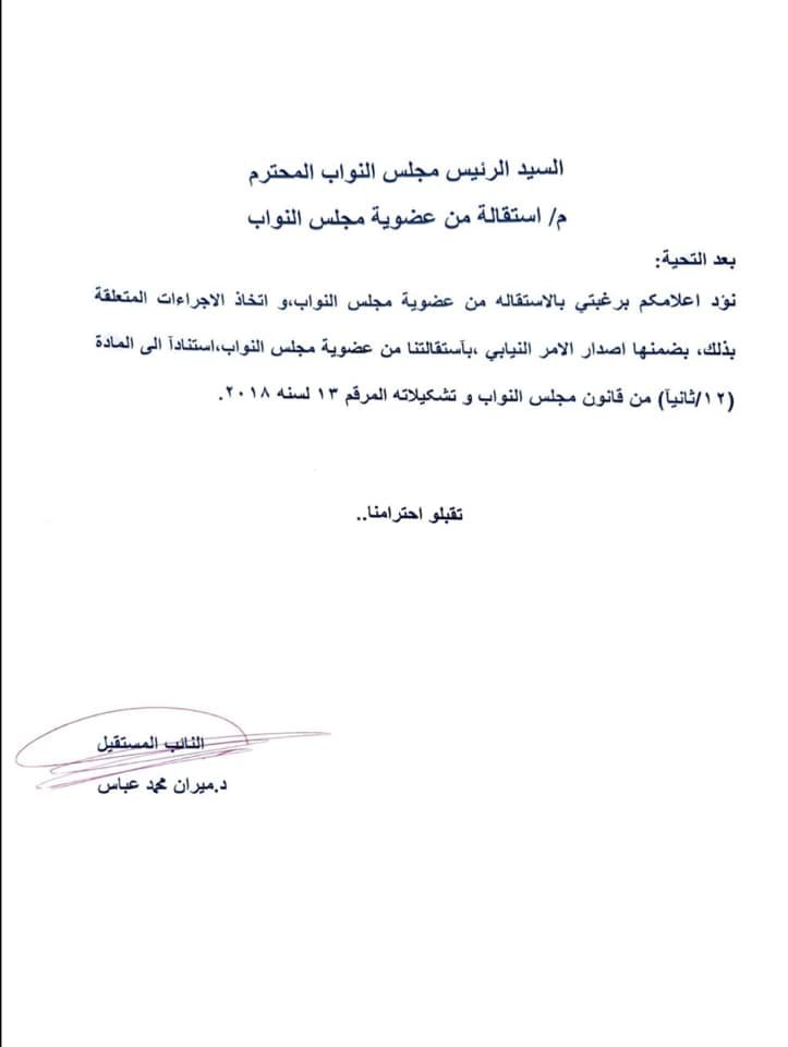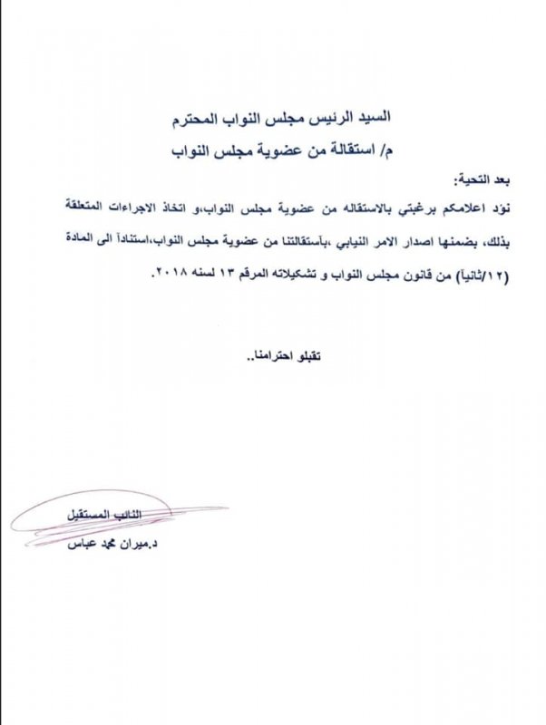 بالوثيقة.. استقالة النائب ميران محمد عباس من عضوية مجلس النواب