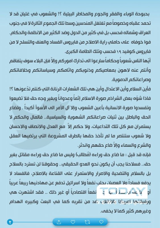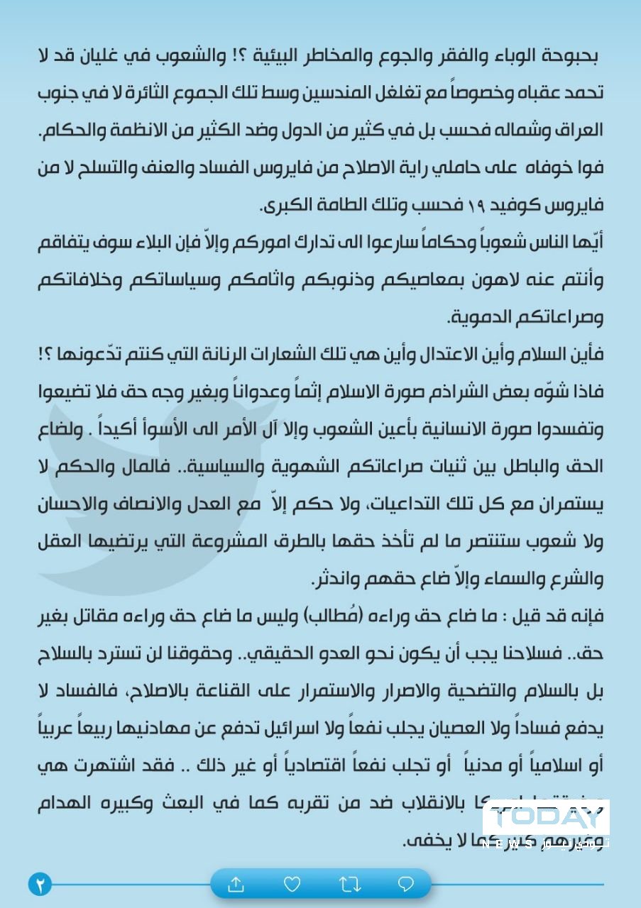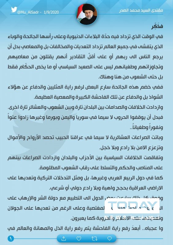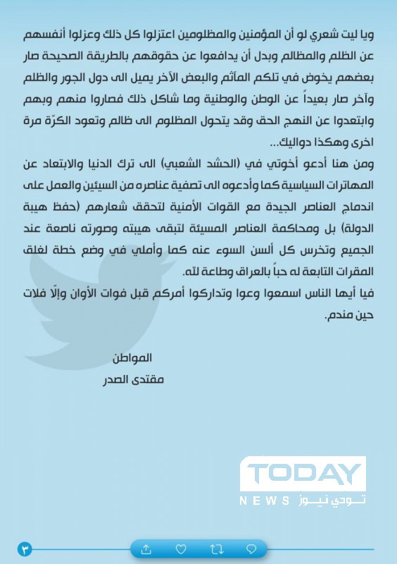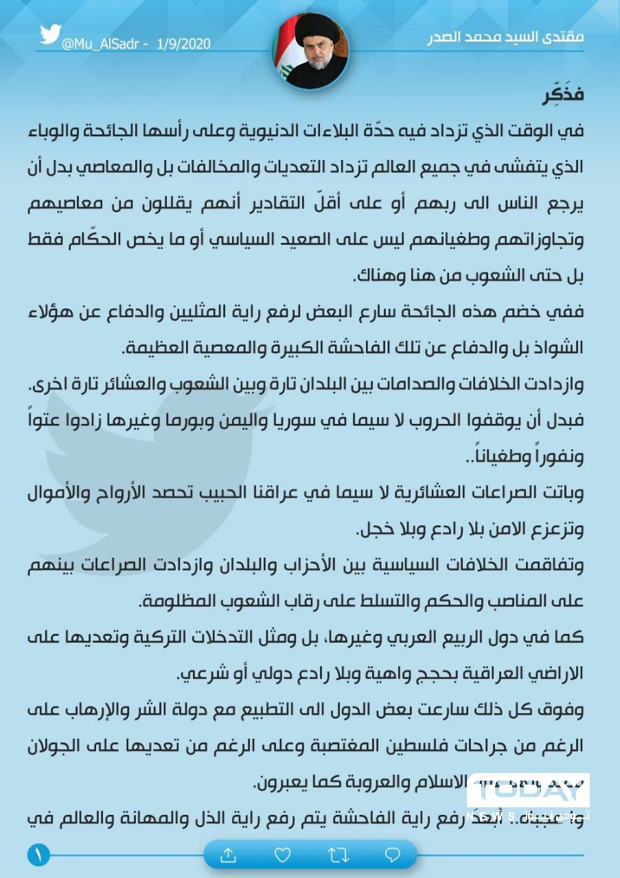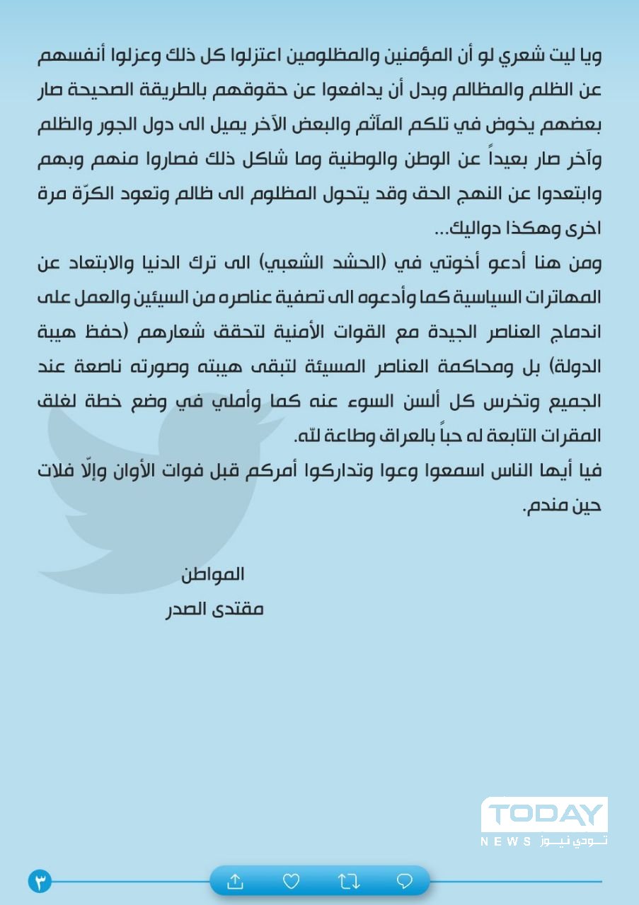 وأنتقد السيد الصدر في تغريدة مطولة على أجزاء النزاعات العشائرية وتفاقم الخلافات السياسية.