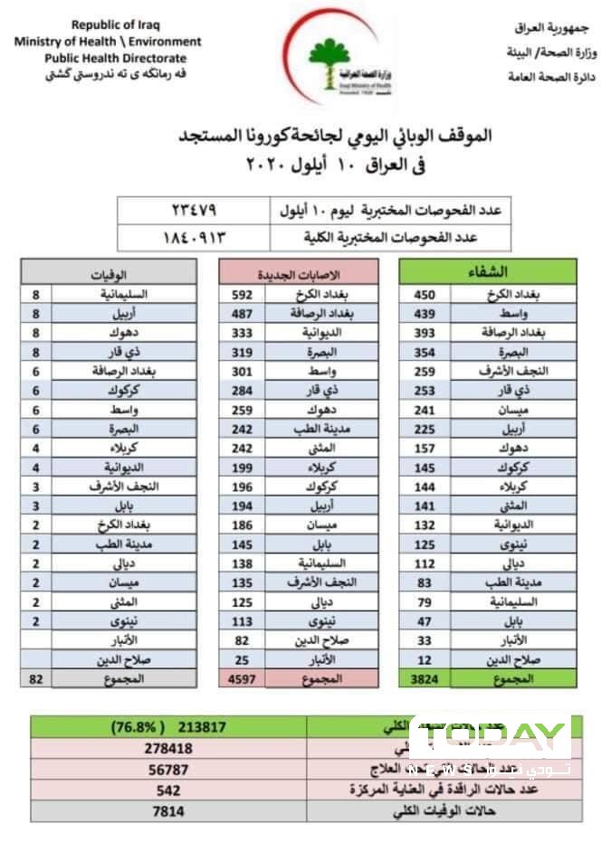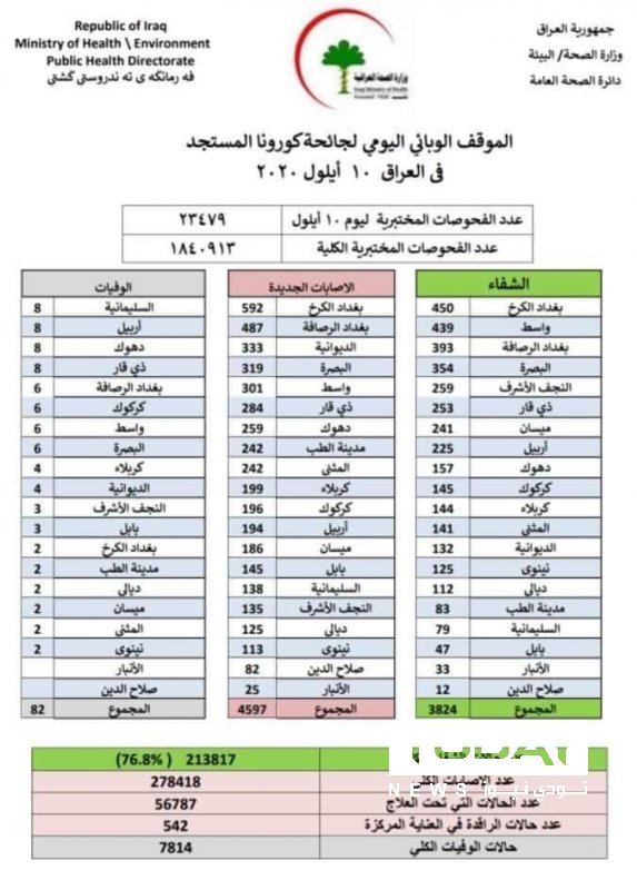 الصحة العراقية تسجل 82 وفاة و 4597 إصابة جديدة بفيروس كورونا