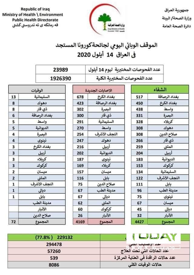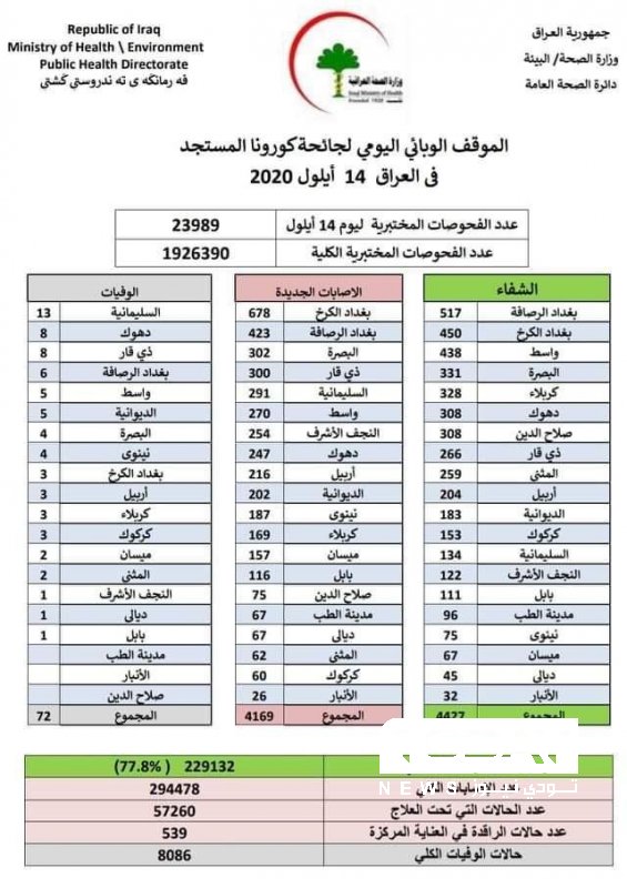 الصحة العراقية تسجل 72 وفاةً و 4169 اصابة جديدة بفيروس كورونا