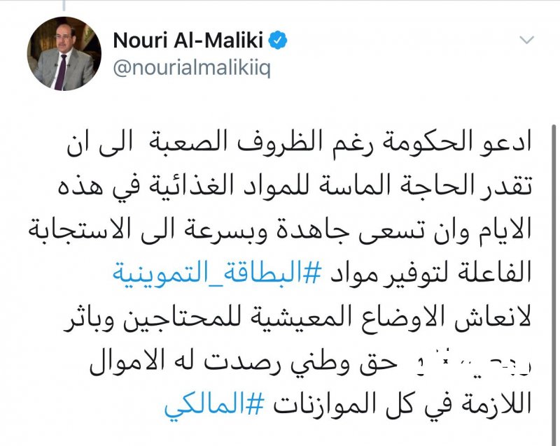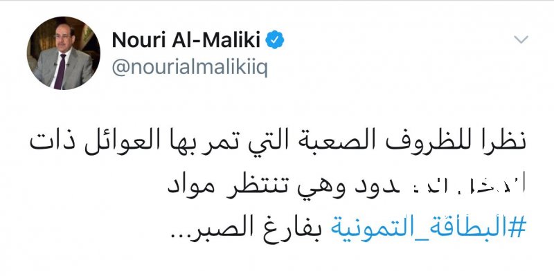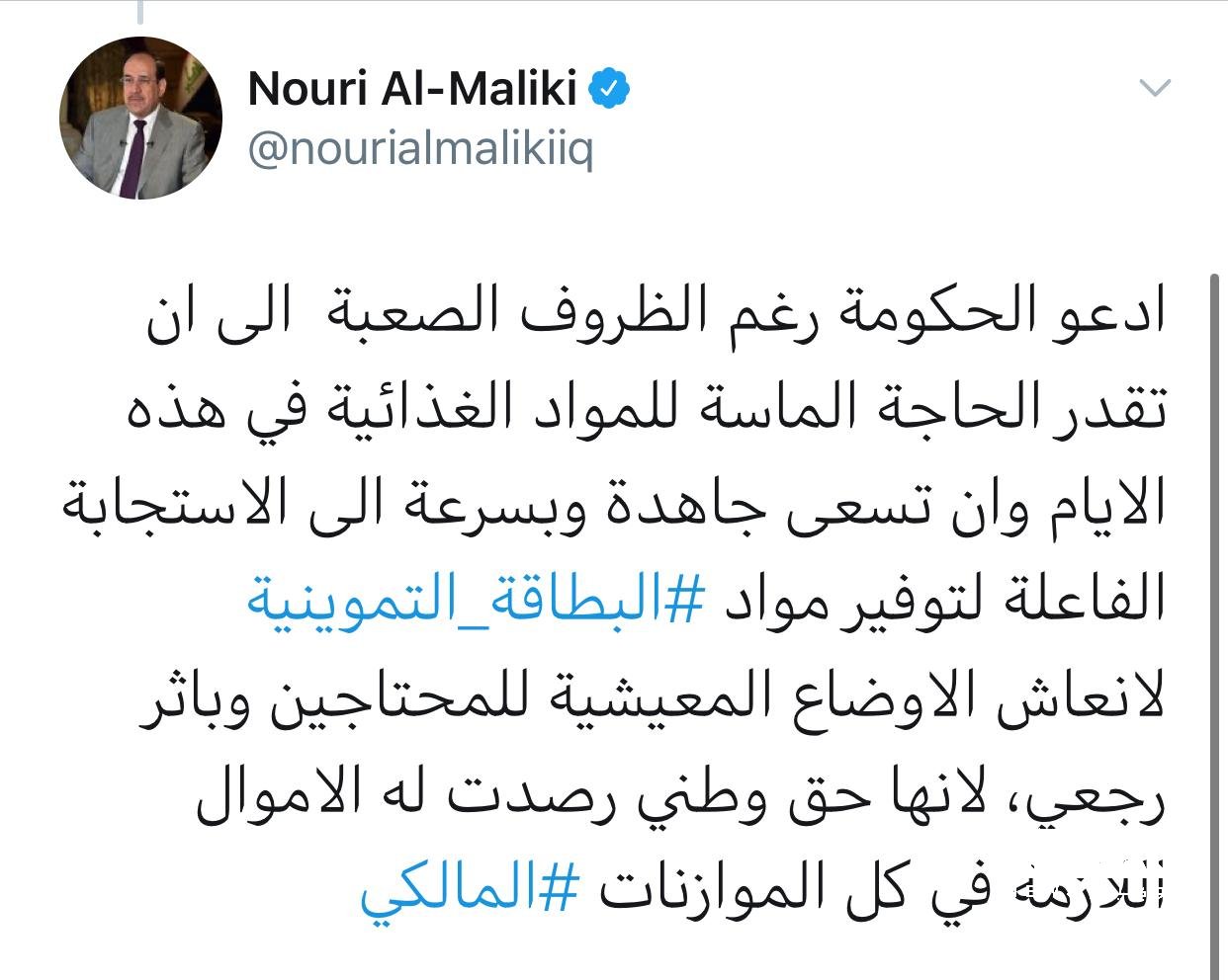 دعا رئيس أئتلاف دولة القانون نوري المالكي ، السبت ، الحكومة لتوفير مفردات البطاقة التموينية كونها حق وطني رصدت الاموال اللازمة له .