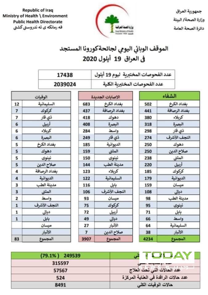 العراق يسجل 3907 إصابات جديدة بكورونا و83 حالة وفاة