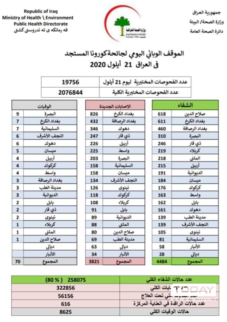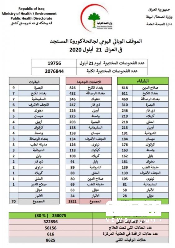 الصحة العراقية تسجل 70 حالة وفاة و 3821 اصابة جديدة بفيروس كورونا