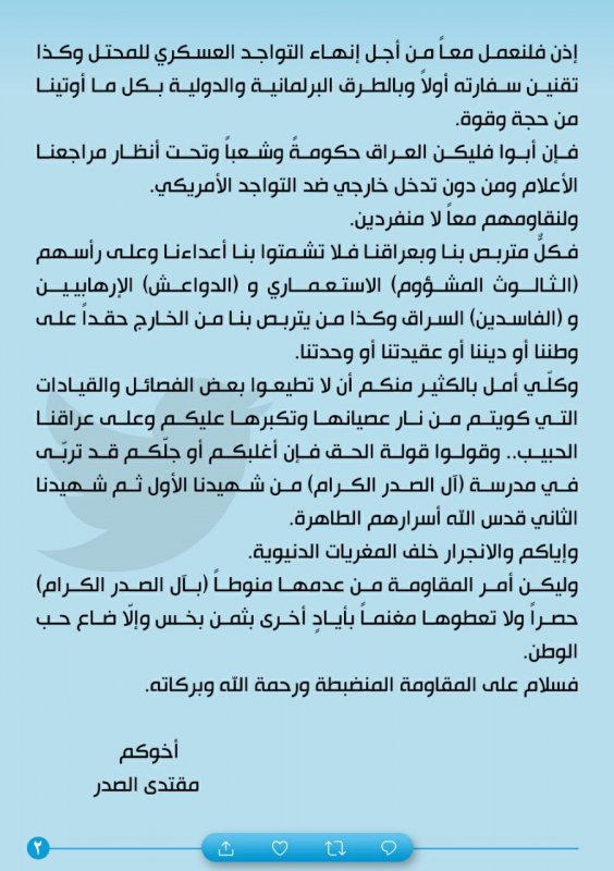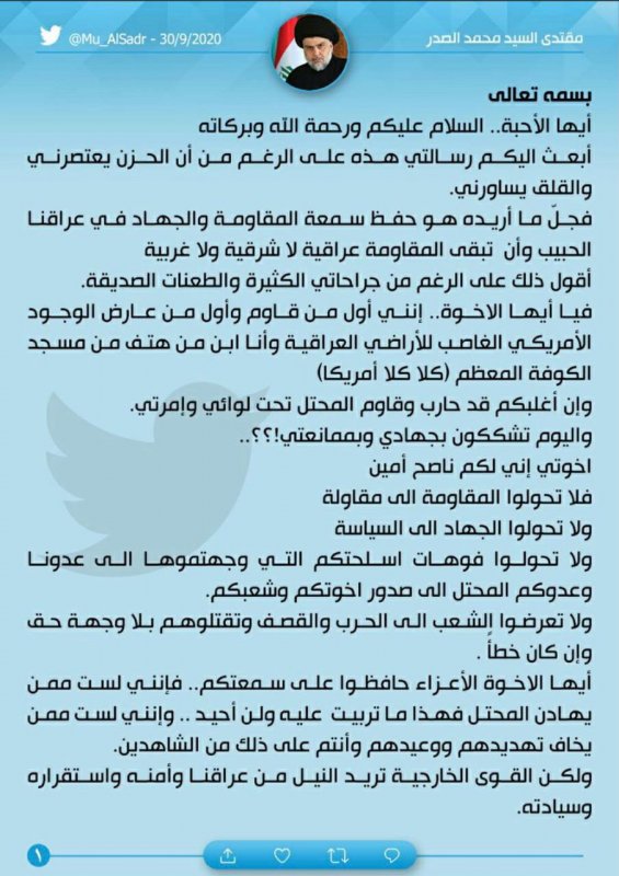 الصدر يوجه رسالة للمقاومة: لا تطيعوا بعض الفصائل والقيادات