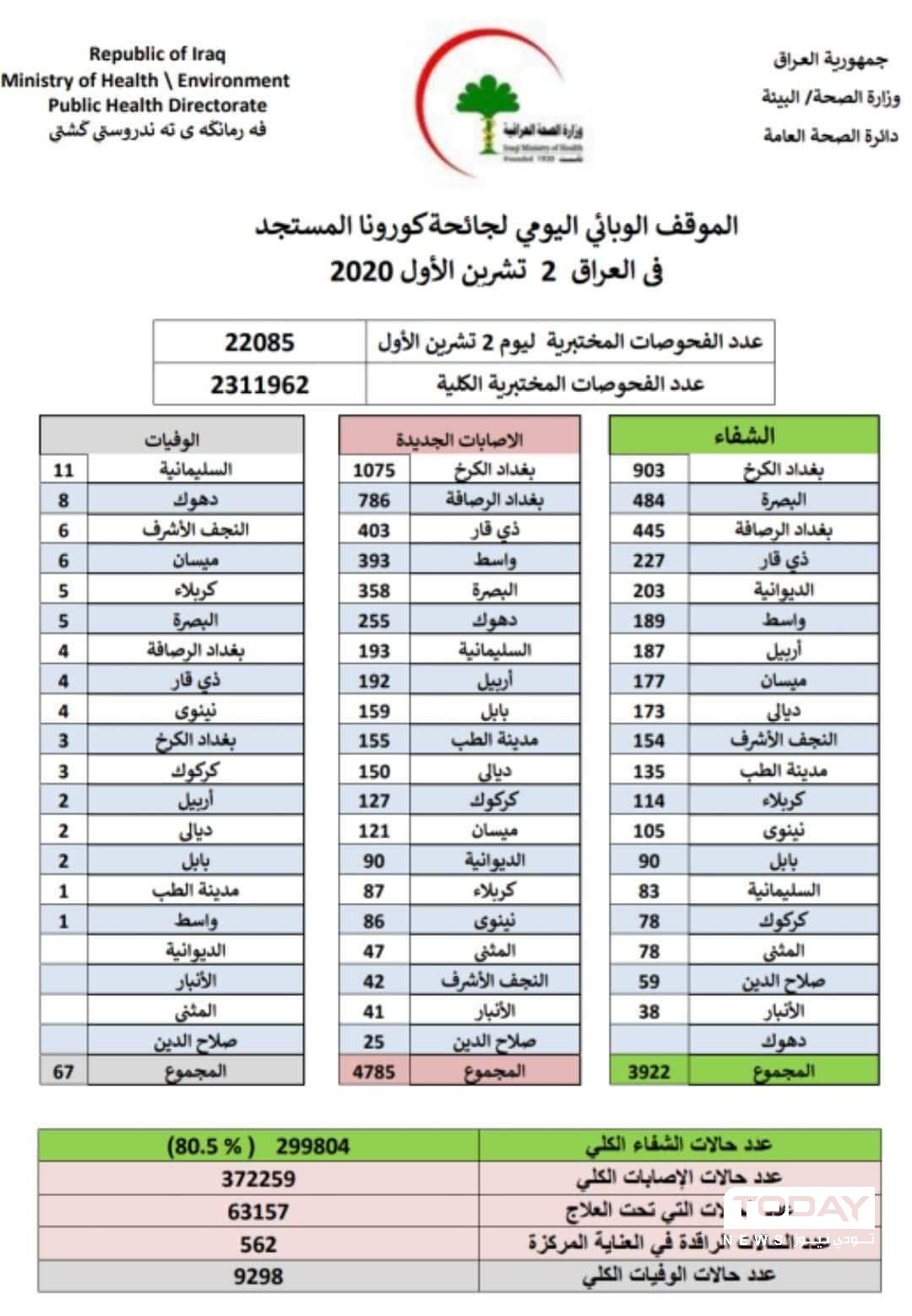 الصحة تعلن عن ٤٧٨٥ اصابة جديدة بفايروس كورونا