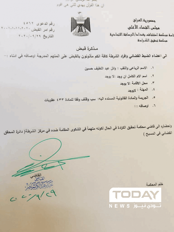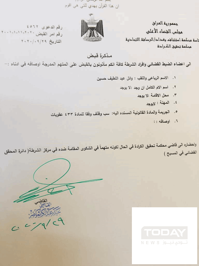 أصدرت محكمة تحقيق الكرادة التابعة لرئاسة محكمة استئناف بغداد/ الرصافة الاتحادية، مذكرة إلقاء قبض بحق النائب السابق وائل عبد اللطيف على إثر دعوى أقامها رئيس تحالف الفتح هادي العامري ضده.