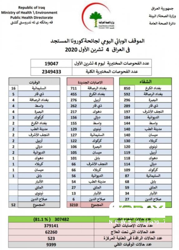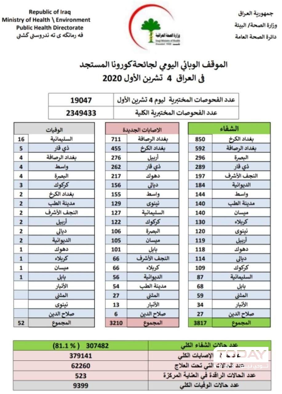 الصحة تسجل 3210 إصابات بكورونا و52 حالة وفاة