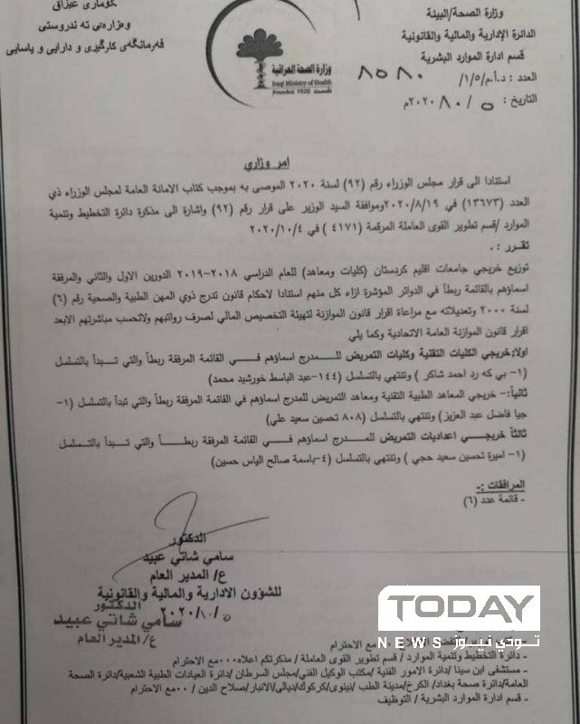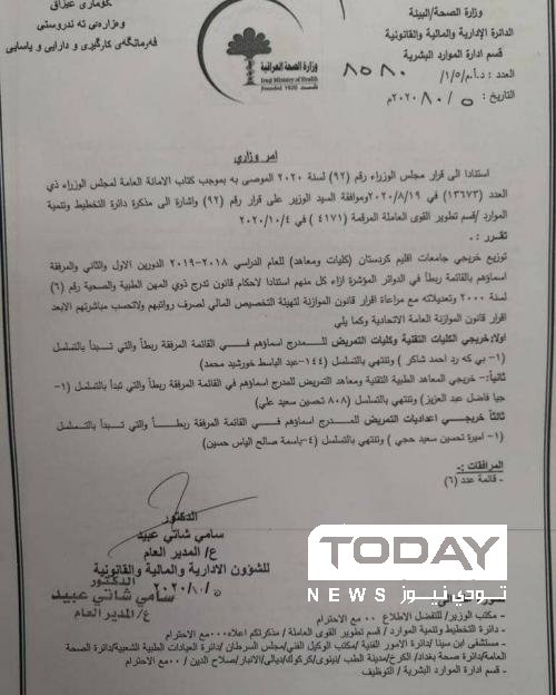 بالوثيقة .. وزارة الصحة تصدر أمراً بتوزيع خريجي جامعات إقليم كردستان