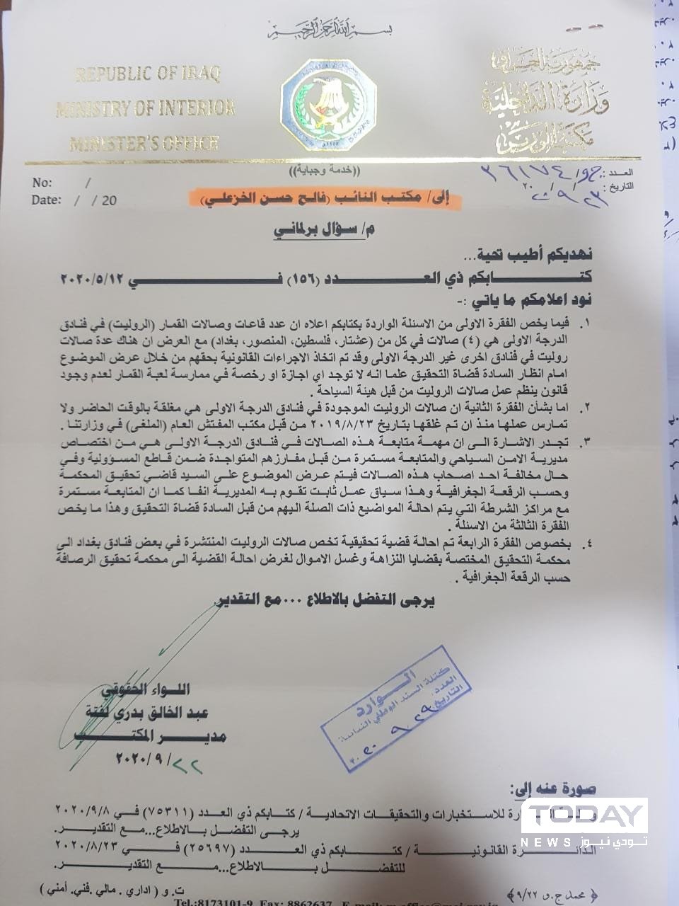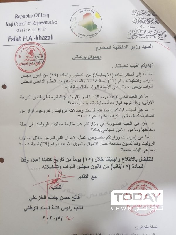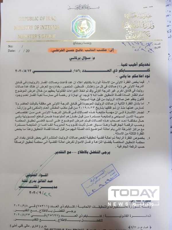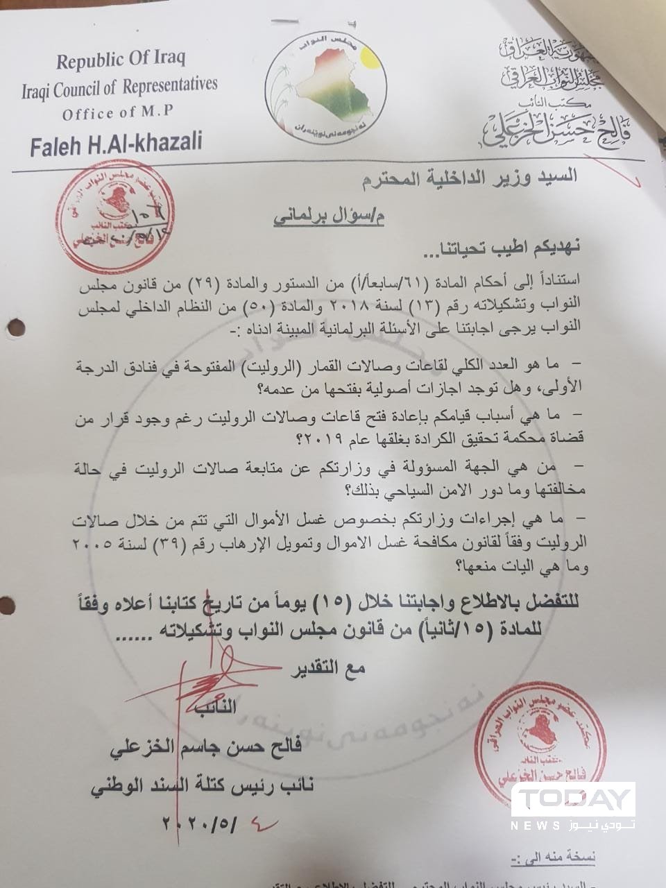 وجه النائب فالح الخزعلي، سؤلاً برلمانياً الى وزير الداخلية حول ملف فساد صالات الروليت وقاعات غسيل الأموال، مؤكدا على ضرورة أن تتحمل الحكومة مسولياتها في متابعة هذا الملف الذي يمثل شكلاً من أشكال الارهاب.