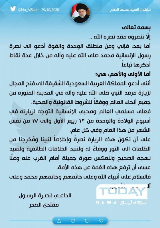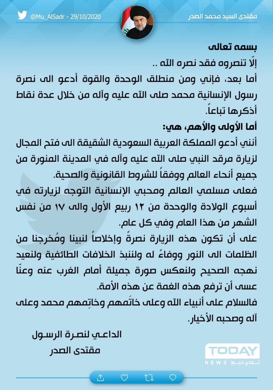 مقتدى الصدر يدعو السعودية لفتح المجال لزيارة مرقد الرسول (ص)