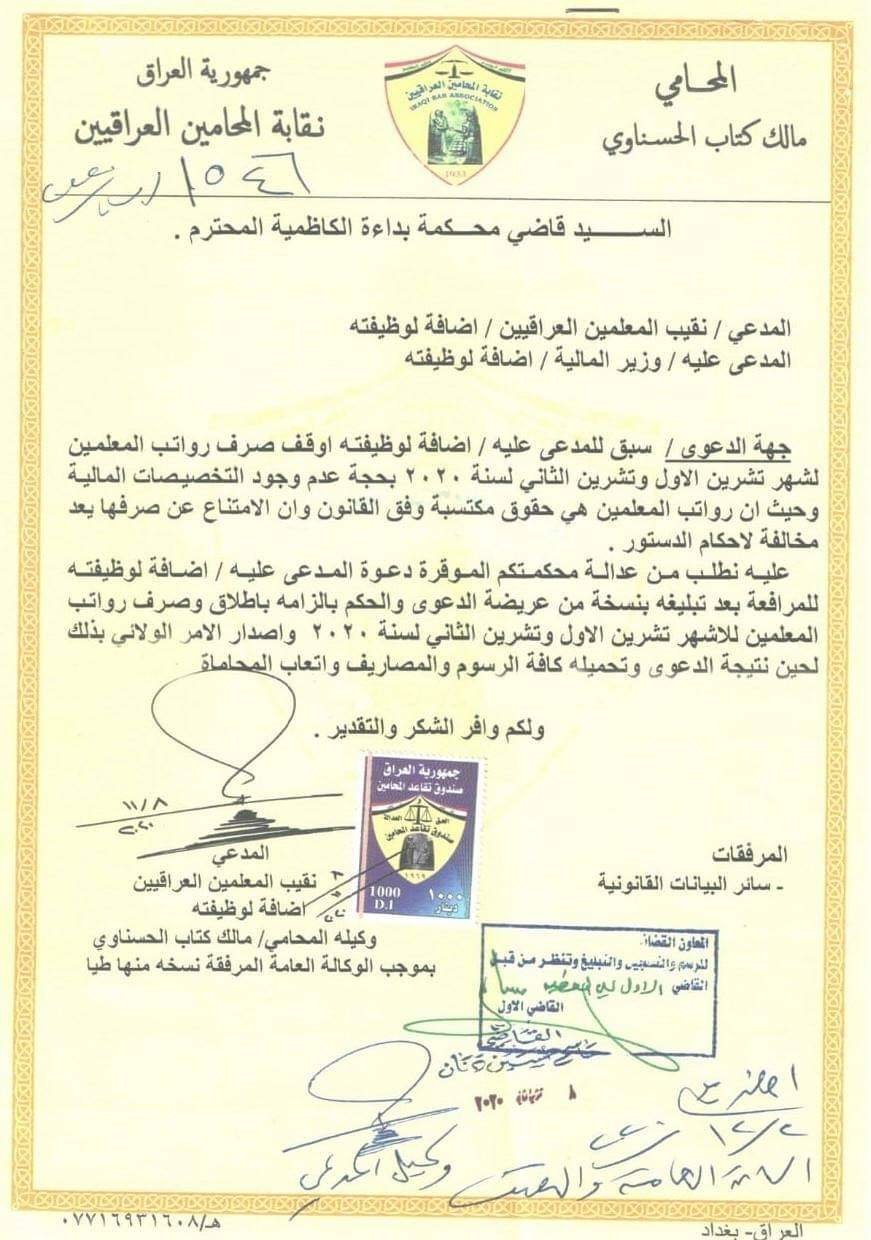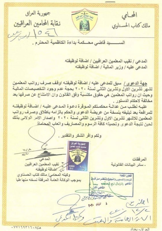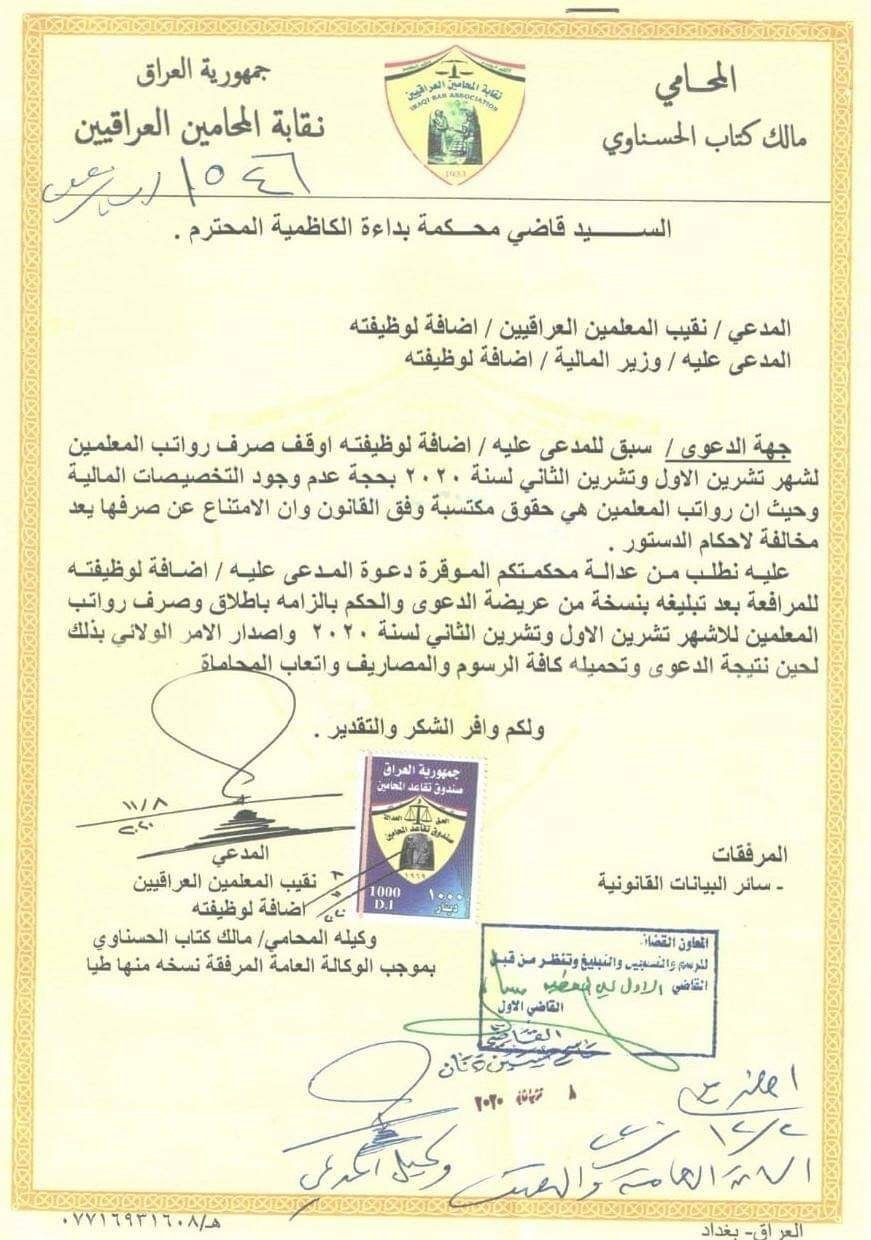 تقدمت نقابة المعلمين العراقيين، يوم الاثنين، إلى مجلس القضاء الاعلى بدعوى قضائية، ضد وزير المالية في حكومة الكاظمي.