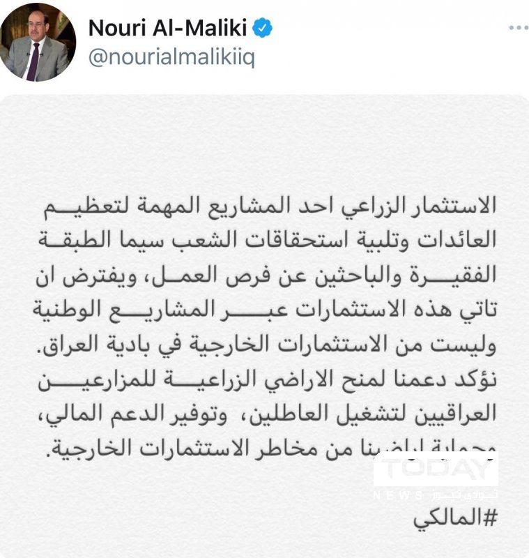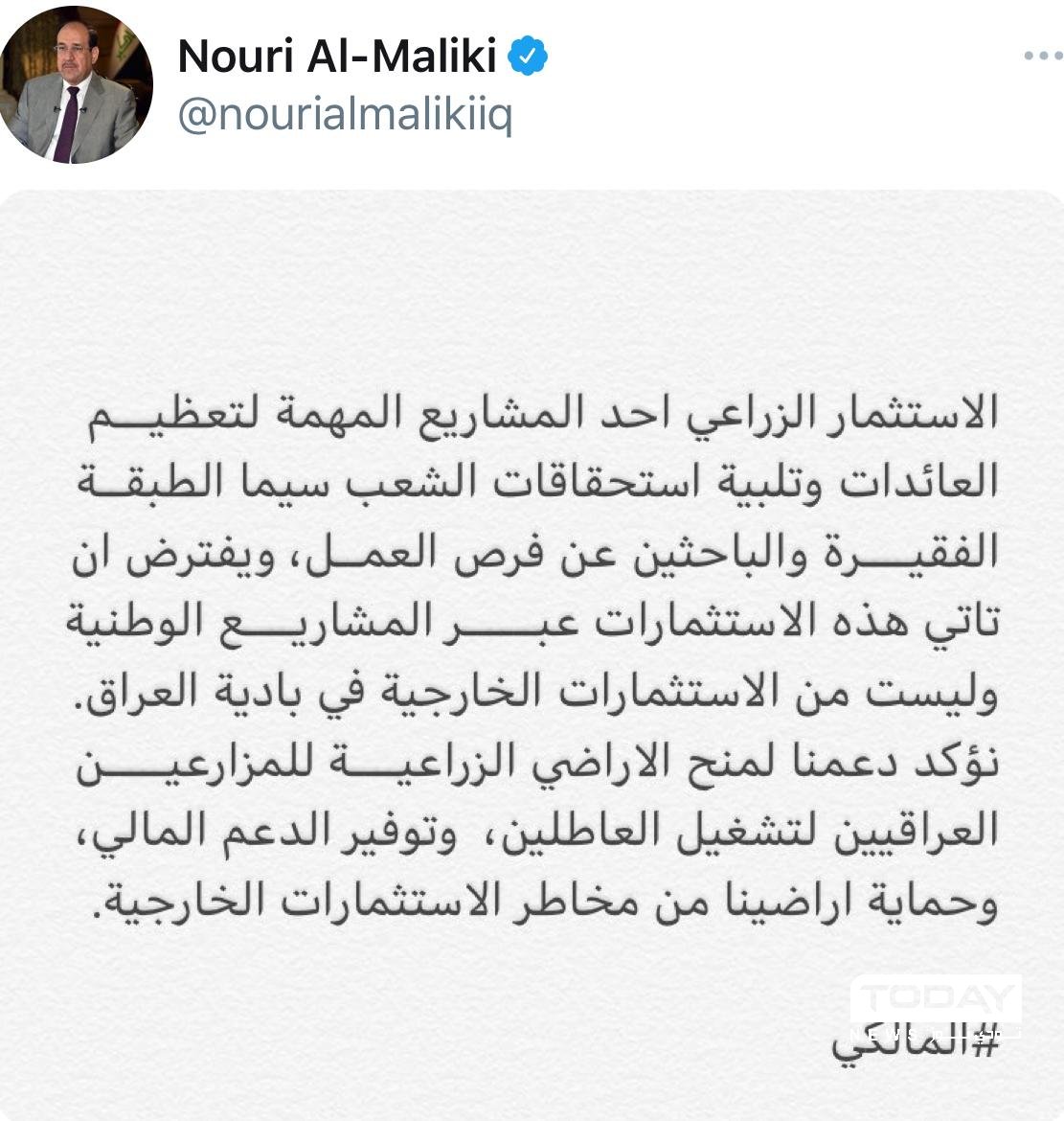 وقال المالكي في تغريده له تابعتها "Today New", يفترض ان" تأتي الاستثمارات من المشاريع الوطنية وليست من الاستثمارات الخارجية في بادية العراق " .