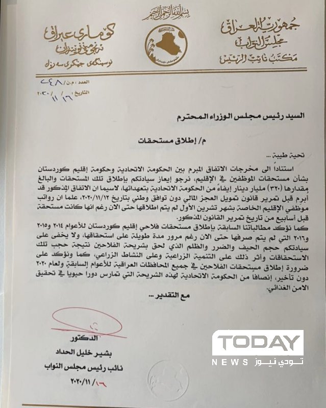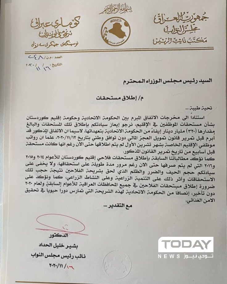 طالب نائب رئيس مجلس النواب العراقي بشير خليل الحداد، اليوم الاربعاء، رئيس مجلس الوزراء مصطفى الكاظمي بإطلاق المستحقات المالية لموظفي الأقليم وفق الإتفاق المبرم بين الحكومة الإتحادية وحكومة أقليم كردستان.