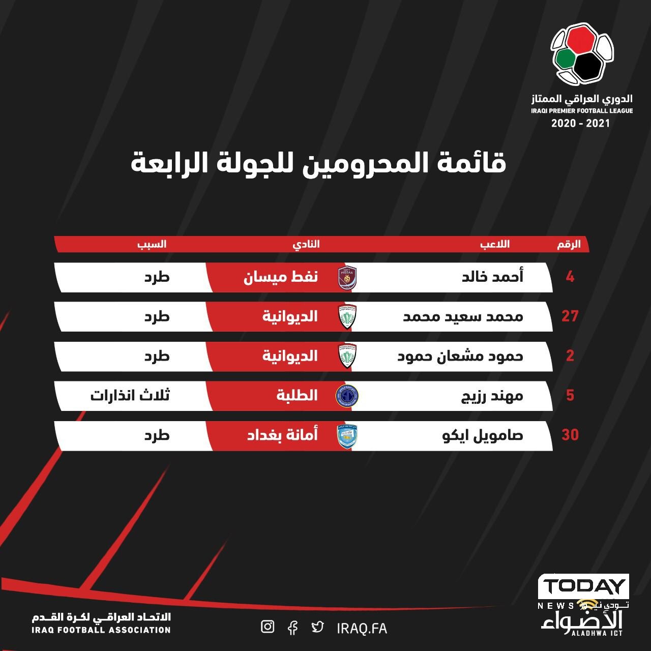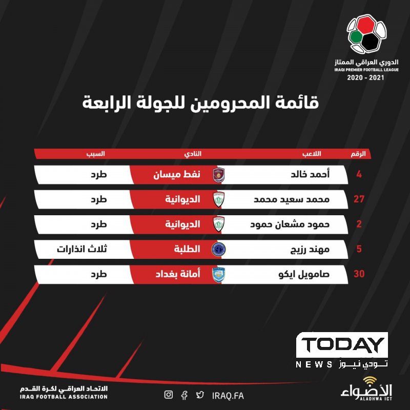 أصدرت الهيئة التطبيعية لاتحاد كرة القدم العراقي قائمة بأسماء اللاعبين المحرومين من مباريات الجولة الرابعة من منافسات الدوري العراقي الممتاز.