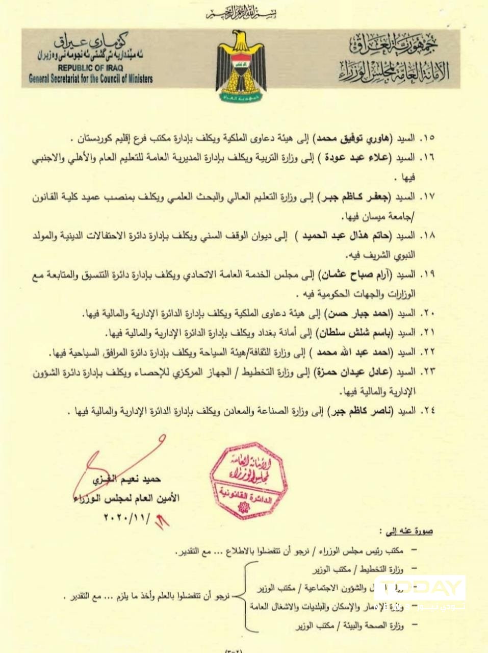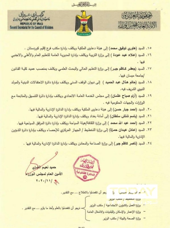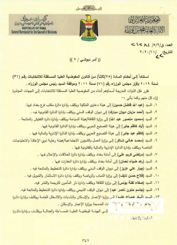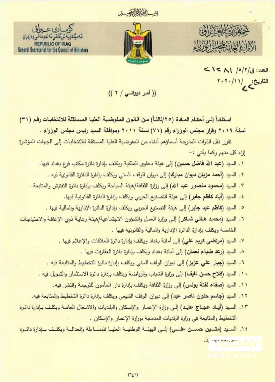 أظهرت وثائق رسمية، صدور أمر ديواني يقضي بإجراء مناقلات لأربعة وعشرين موظفاً من مفوضية الإنتخابات إلى دوائر حكومية متفرقة.
