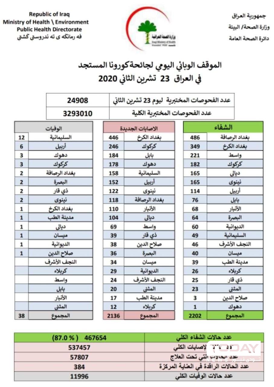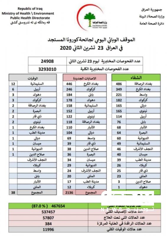 الصحة تسجل 2136 إصابة جديدة بفيروس كورونا مقابل 2202 حالة شفاء