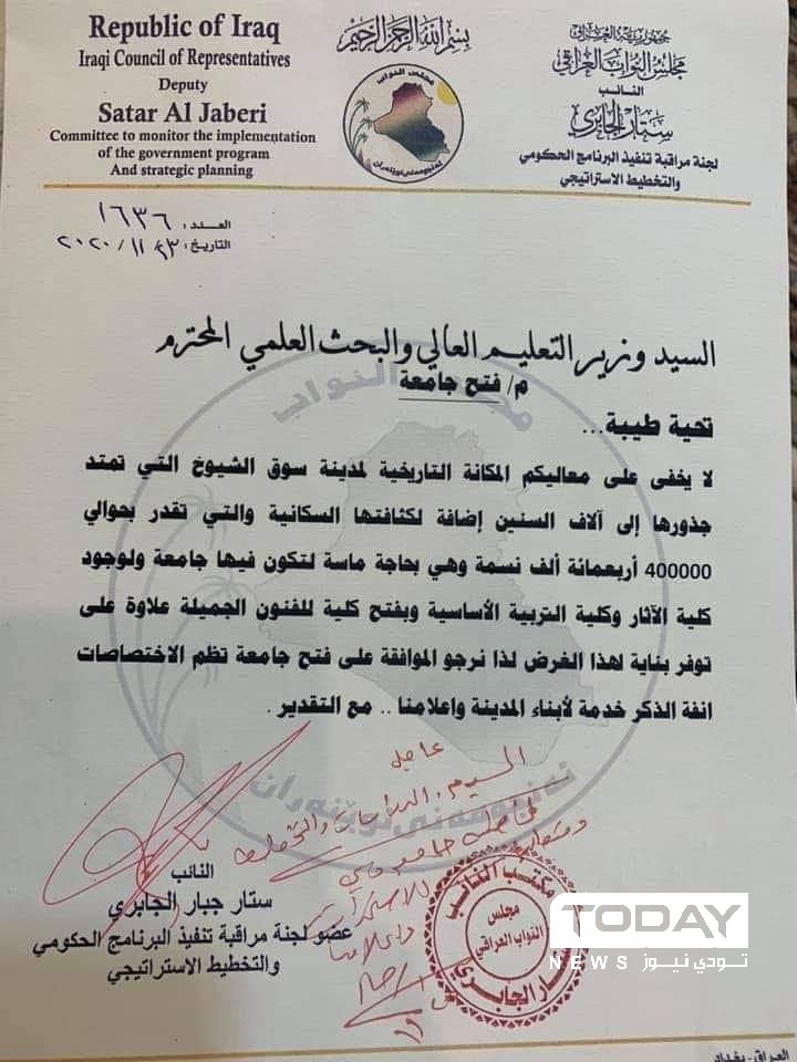اعلن النائب ستار الجابري، الخميس، عن استحصال موافقة وزير التعليم العالي بفتح جامعة سوق الشيوخ بمحافظة ذي قار.