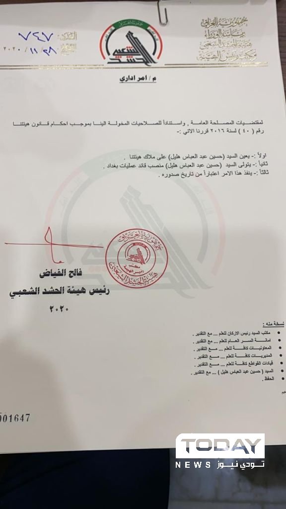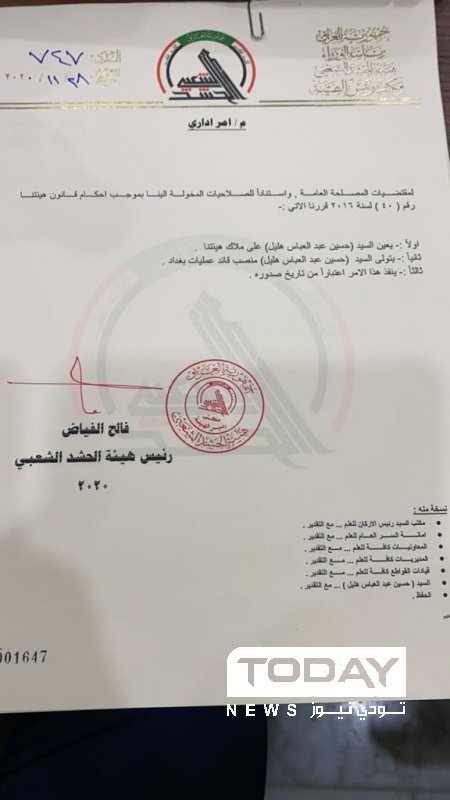الحشد الشعبي يقرر تعيين قائد جديد لعمليات بغداد..وثيقة