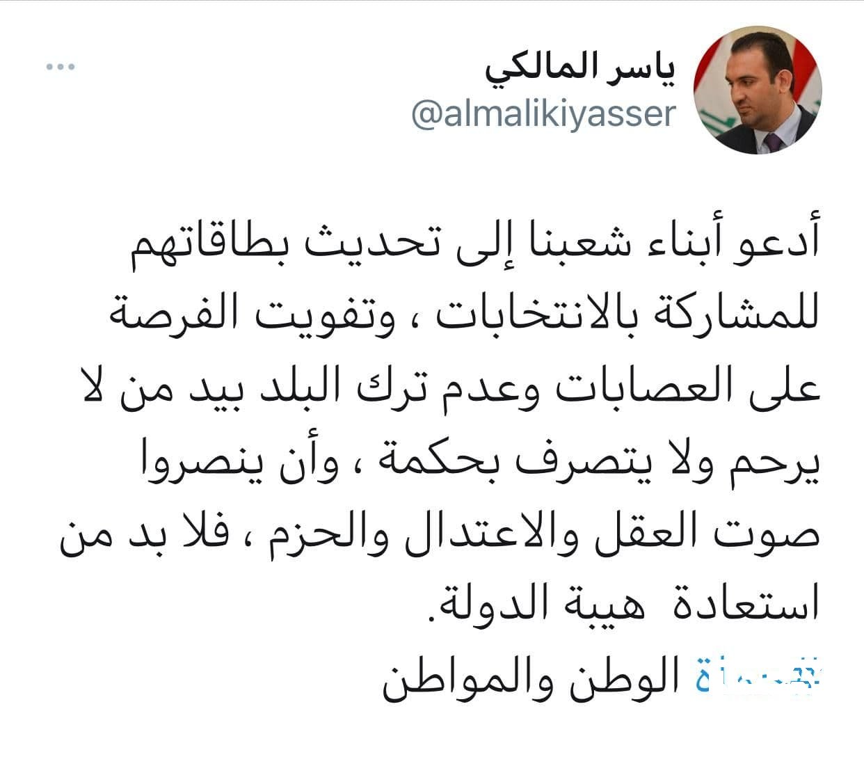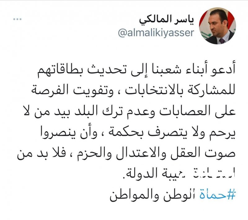 وقال المالكي في تغريدة له: "أدعو أبناء شعبنا إلى تحديث بطاقاتهم للمشاركة بالانتخابات ، وتفويت الفرصة على العصابات وعدم ترك البلد بيد من لا يرحم ولا يتصرف بحكمة".