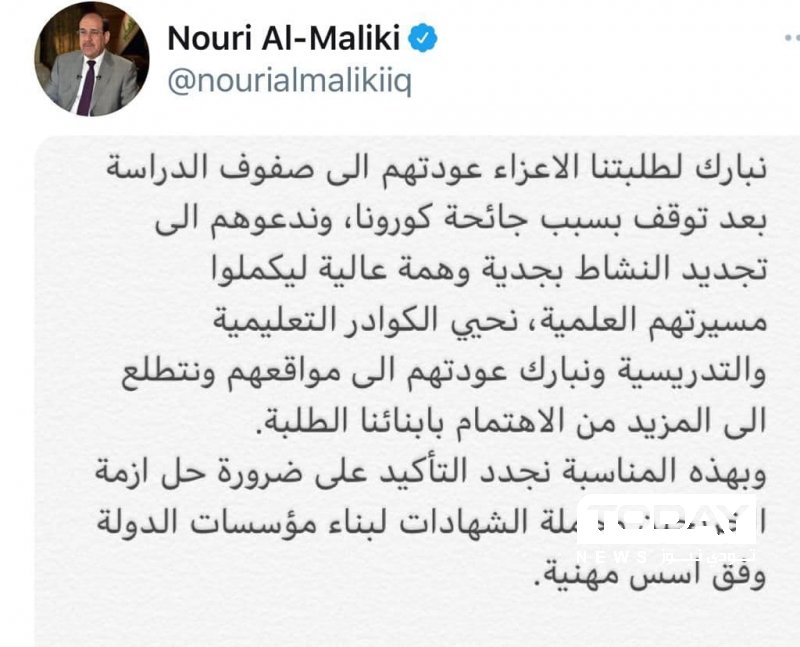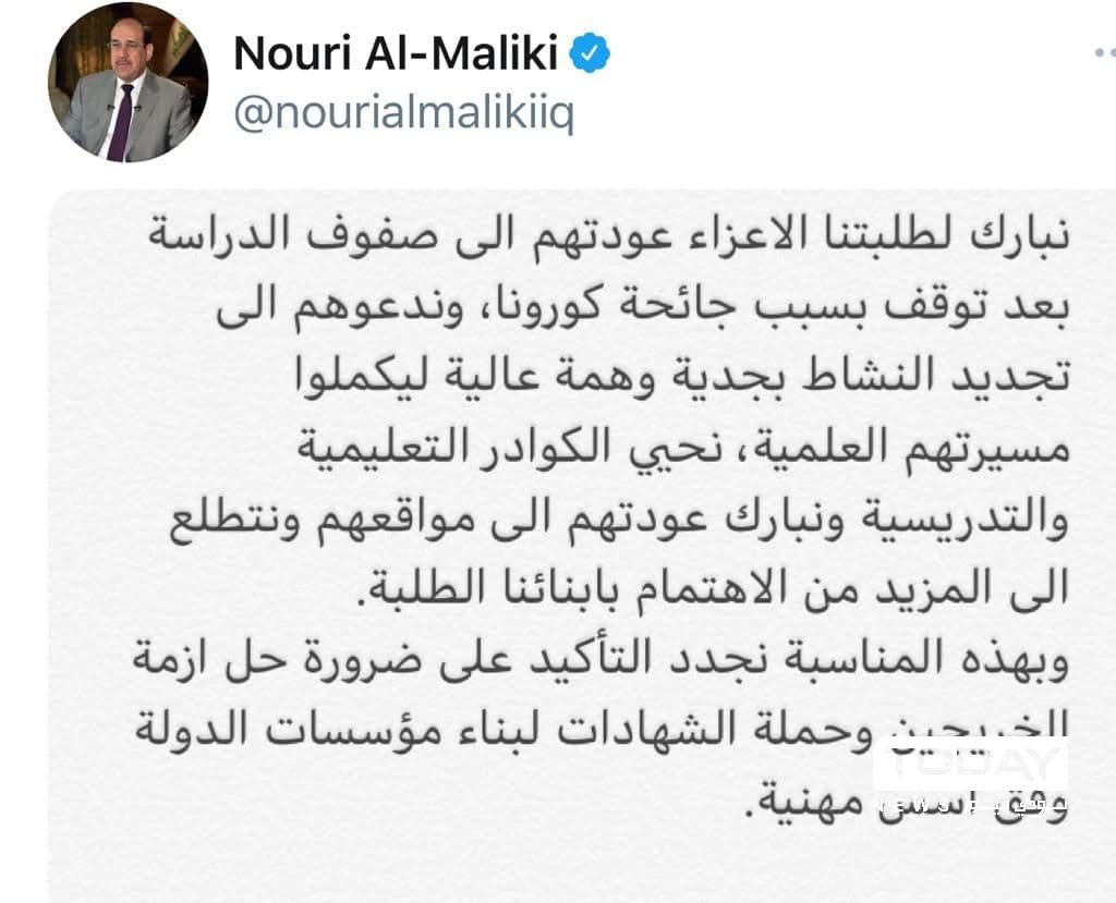وقال المالكي، عبر تغريدة على منصة تويتر تابعتها "Today News": "نبارك لطلبتنا الأعزاء عودتهم إلى صفوف الدراسة بعد توقف بسبب جائحة كورونا، وندعوهم إلى تجديد النشاط بجدية وهمة عالية ليكملوا مسيرتهم العلمية".