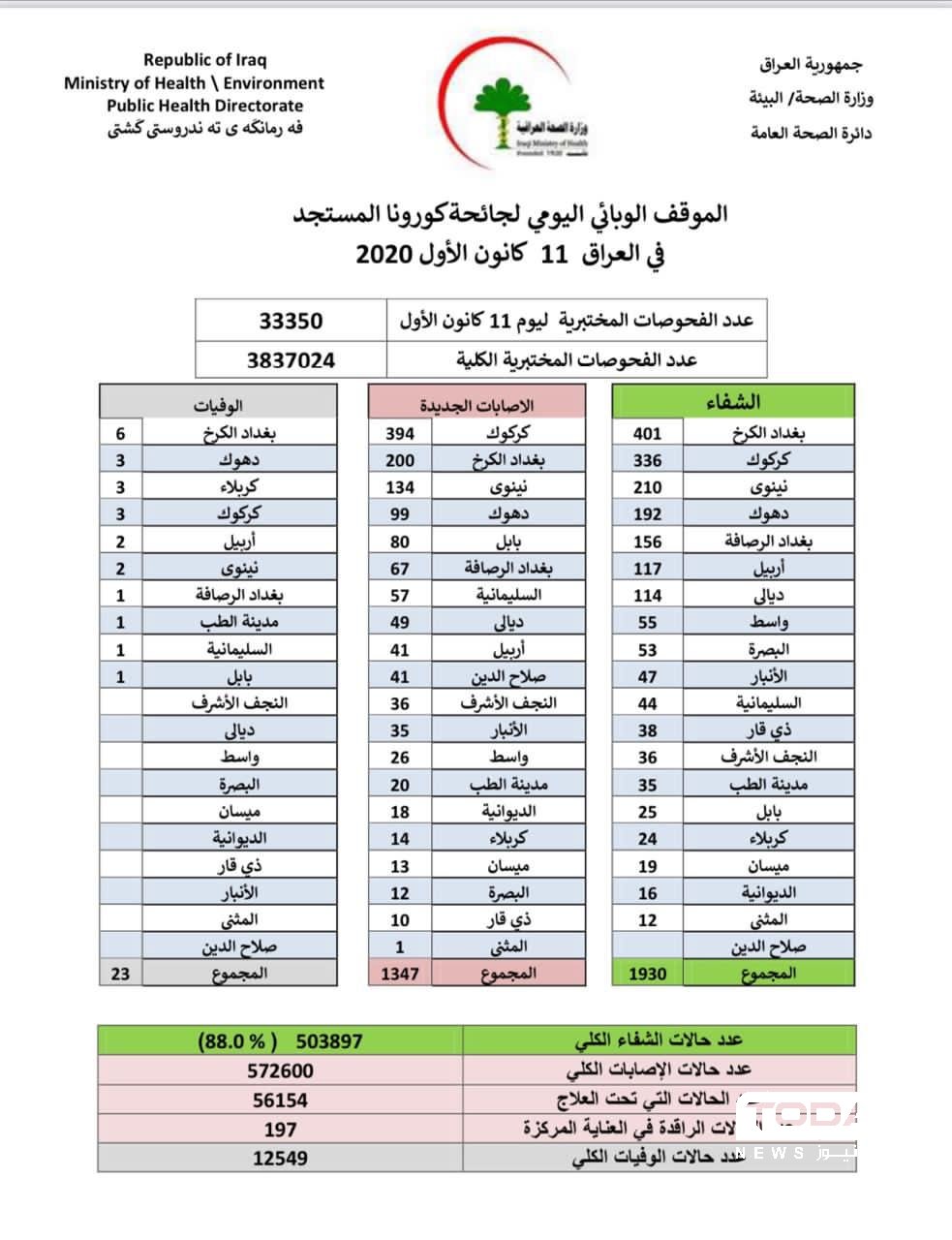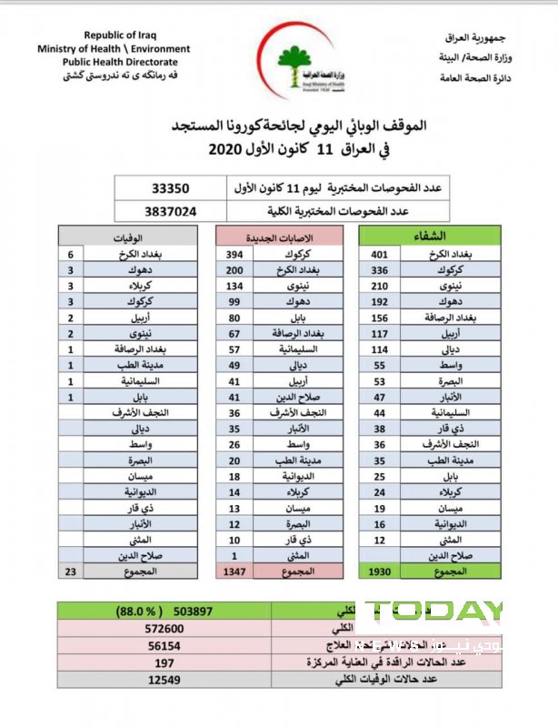 اعلنت وزارة الصحة، اليوم الجمعة، تسجيل 1347 اصابة جديدة بفيروس كورونا مقابل 1930 حالة شفاء خلال الـ24 ساعة الماضية في العراق.