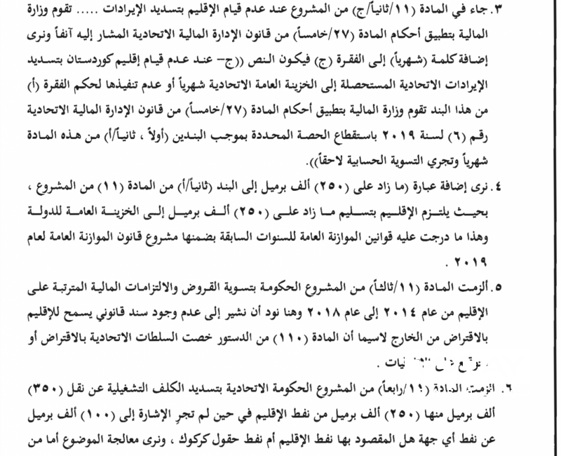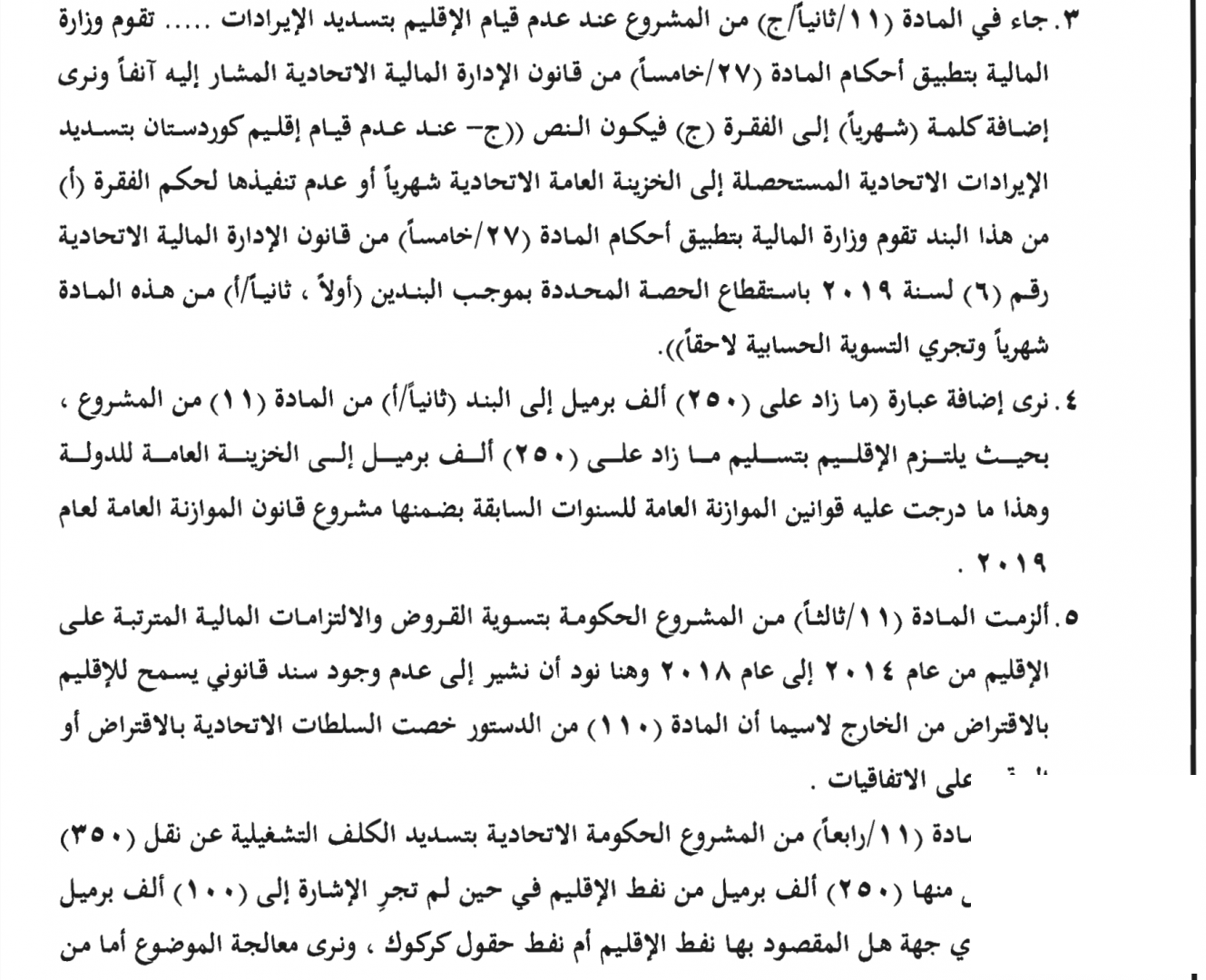 وتضمن المشروع منح رئيس وزراء إقليم كوردستان، صلاحية اجراء المناقلة بين اعتمادات الموازنة الخاصة بالإقليم، "ولا نؤيد ذلك كون الموضوع يخص الإقليم نفسه ولمنح رئيس وزراء الإقليم المرونة الكافية دون الحاجة إلى معالجة الموضوع المذكور في الموازنة العامة الاتحادية إذ أن للإقليم موازنته الخاصة".