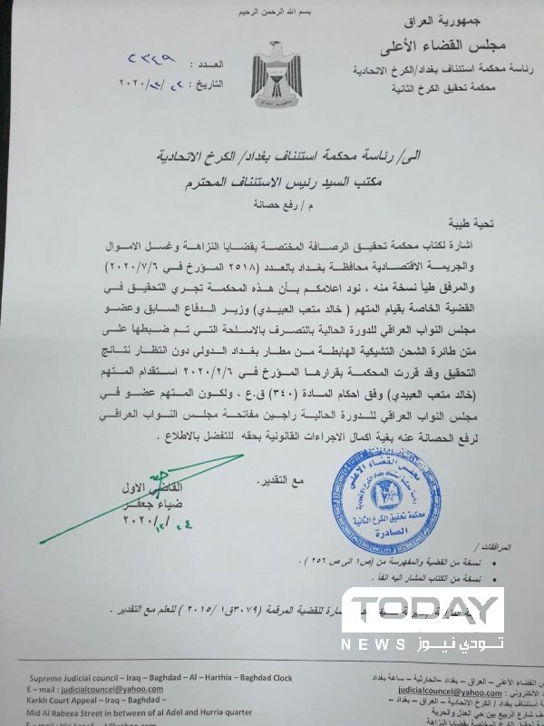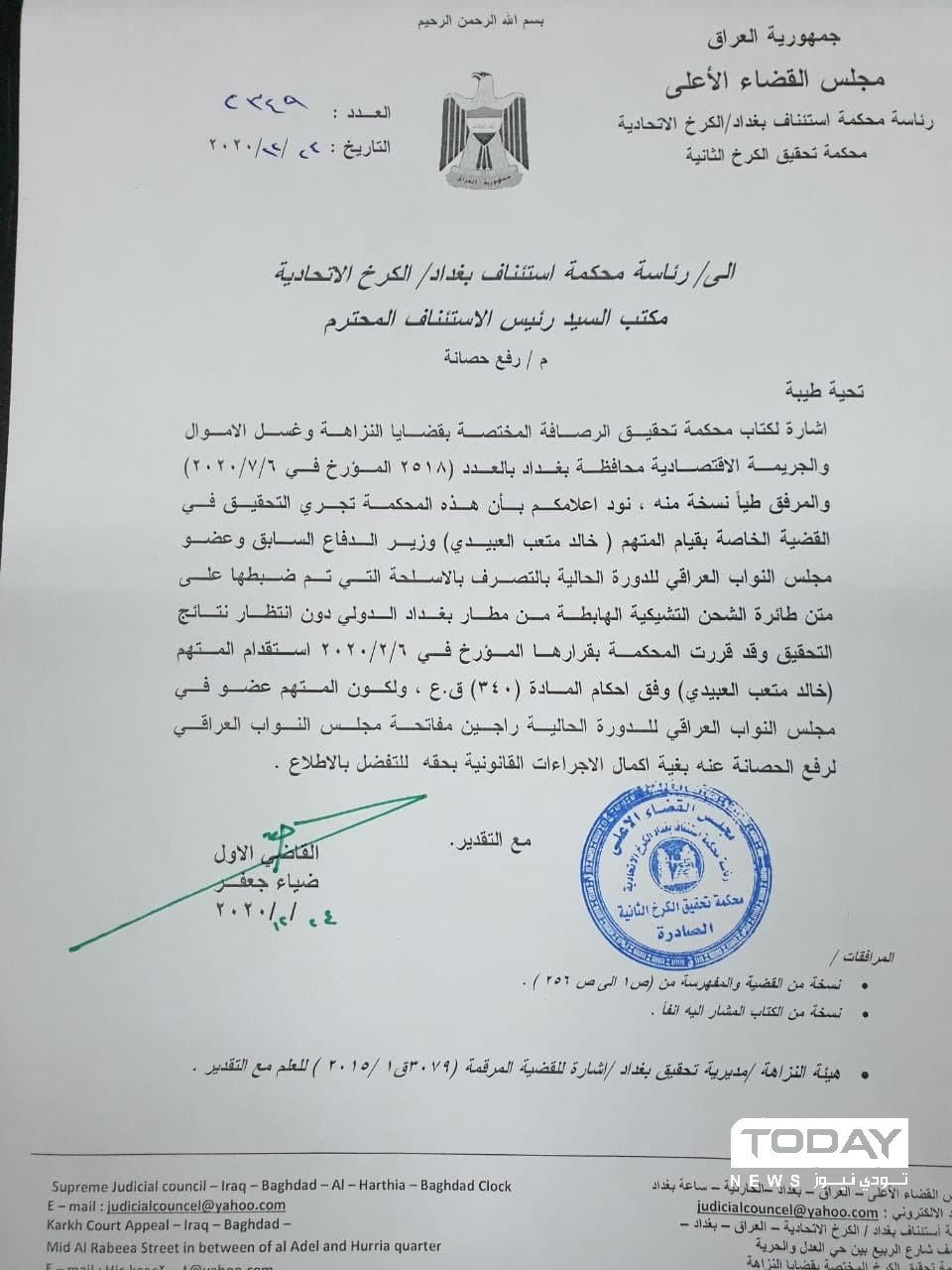 نشرت النائبة عالية نصيف، اليوم الأحد، وثيقة صادرة من القضاء، تضمنت مطالبة الأخير برفع الحصانة عن وزير الدفاع الأسبق خالد العبيدي.