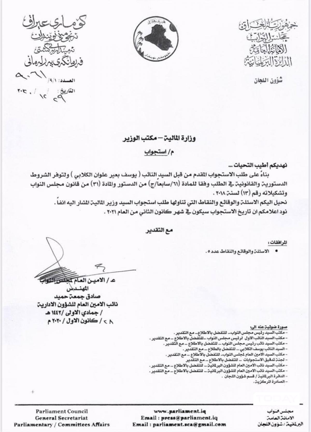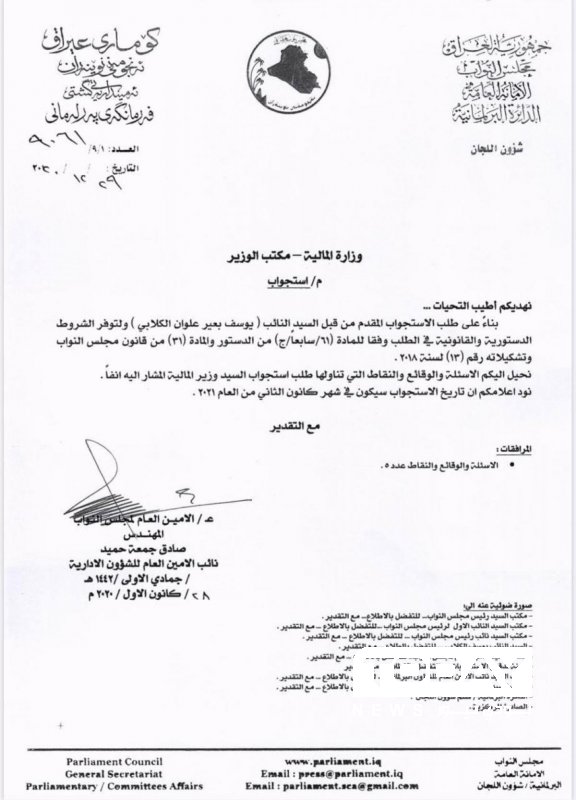 بالوثيقة .. البرلمان يحدد شهر كانون الثاني موعدا لاستجواب وزير المالية