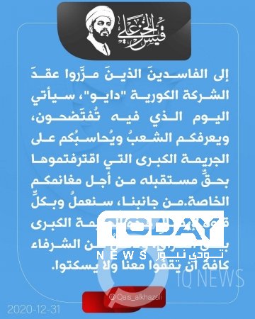 وقال الخزعلي، عبر تغريدة على منصة تويتر، "إلى الفاسدين الذين مرروا عقد الشركة الكورية ’’دايو’’ سيأتي اليوم الذي فيه تفتضحون، ويعرفكم الشعب ويحاسبكم على الجريمة الكبرى التي اقترفتموها".