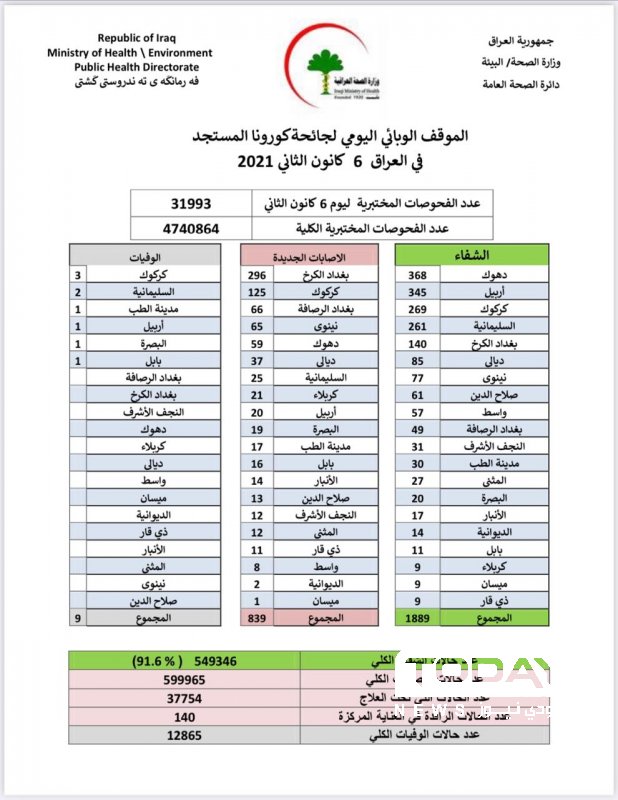 العراق يسجل 1889 حالة شفاء مقابل 839 إصابة جديدة بكورونا