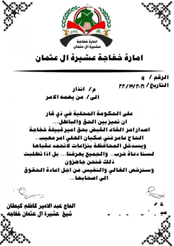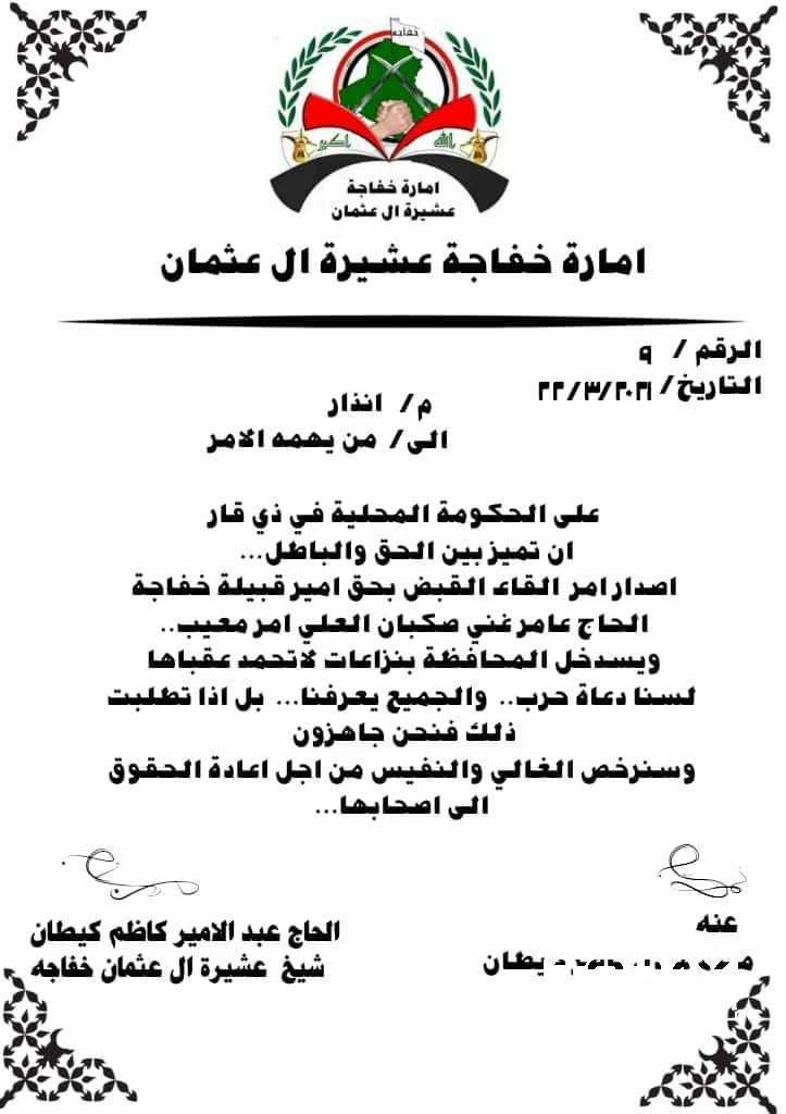 أصدرت إمارة خفاجة في العراق، إنذارا جديدا لحكومة ذي قار، على خلفية القبض على شيخ عشيرة خفاجة العام بالمحافظة، فيما دعت إلى تجنيب محافظتهم "ما لا يحمد عقباه".