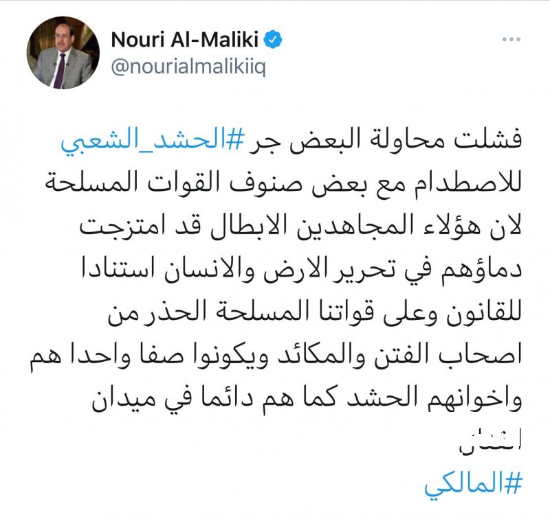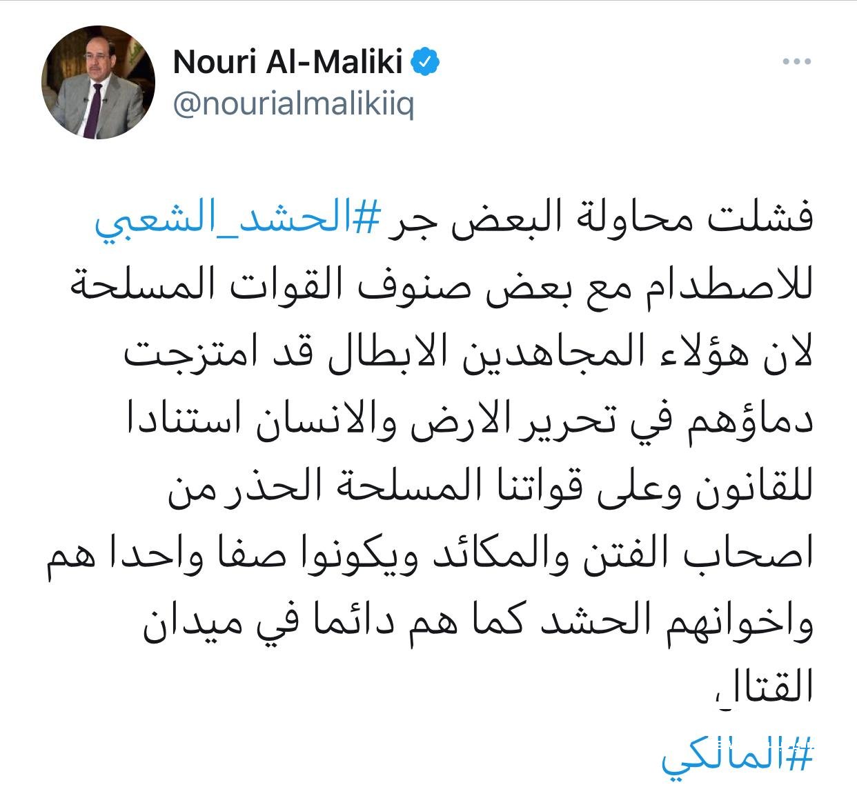 وقال المالكي في تغريدة له: انه "فشلت محاولة البعض جر الحشد الشعبي للاصطدام مع بعض صنوف القوات المسلحة لان هؤلاء المجاهدين الابطال قد امتزجت دماؤهم في تحرير الارض والانسان استنادا للقانون".