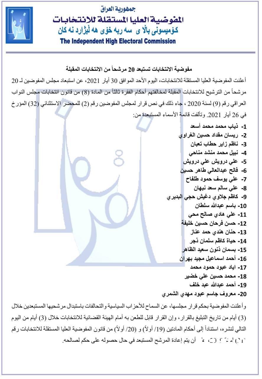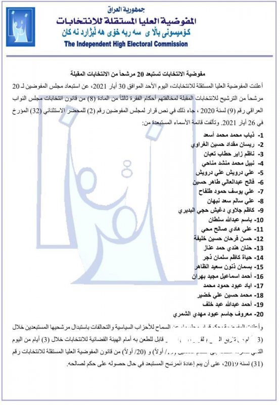 بالوثيقة.. المفوضية تستبعد 20 مرشحاً من الانتخابات المقبلة