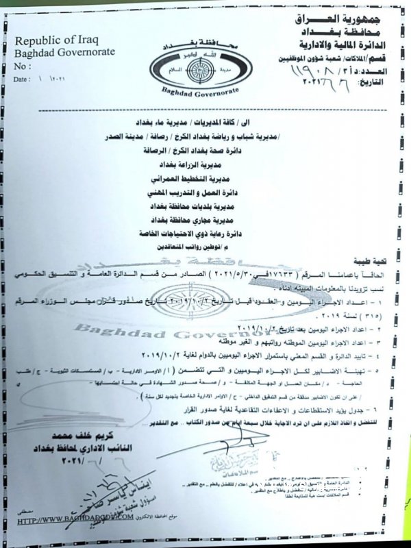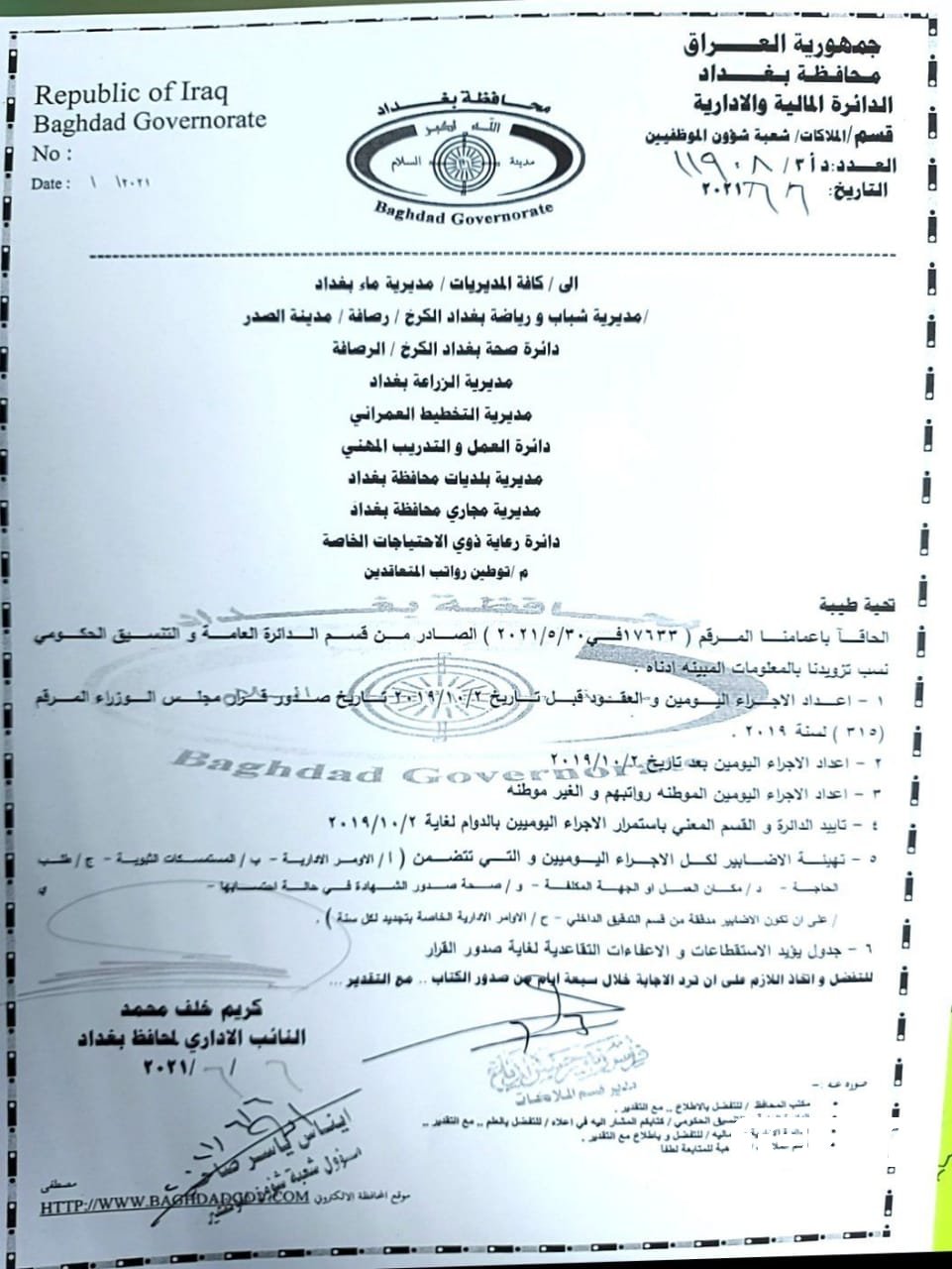 وأمهلت المحافظة بغداد، "الدوائر المعنية مدة ٧ ايام لرد الاجابات، وبيان اعداد العاملين، وبياناتهم المطلوبة، ليتسنى مفاتحة ديوان الرقابة المالية الاتحادي لاكمال متطلبات تحويل الاجراء الى عقود".