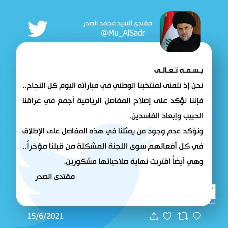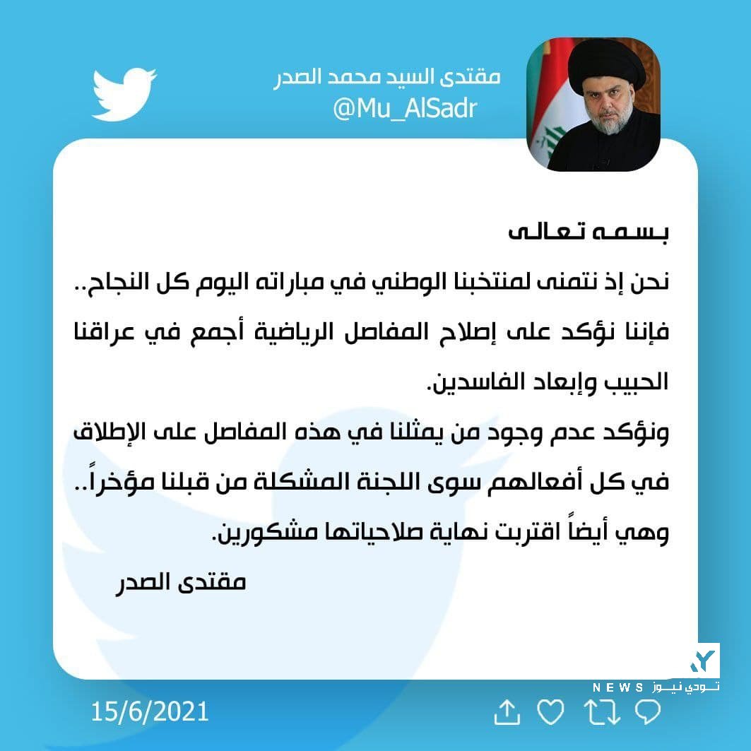 وقال الصدر في تغريدة على موقع تويتر، "نحن إذ نتمنى لمنتخبنا الوطني في مباراة اليوم كل النجاح، فأننا نؤكد على إصلاح المفاصل الرياضية أجمع في عراقنا الحبيب، وإبعاد الفاسدين".