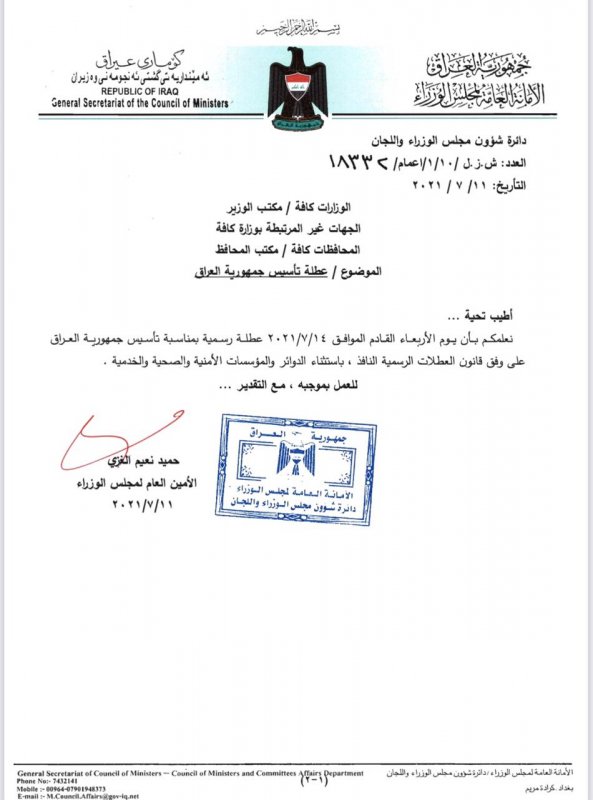 العراق يعطل الدوام الرسمي يوم 14 تموز بذكرى تأسيس جمهوريته