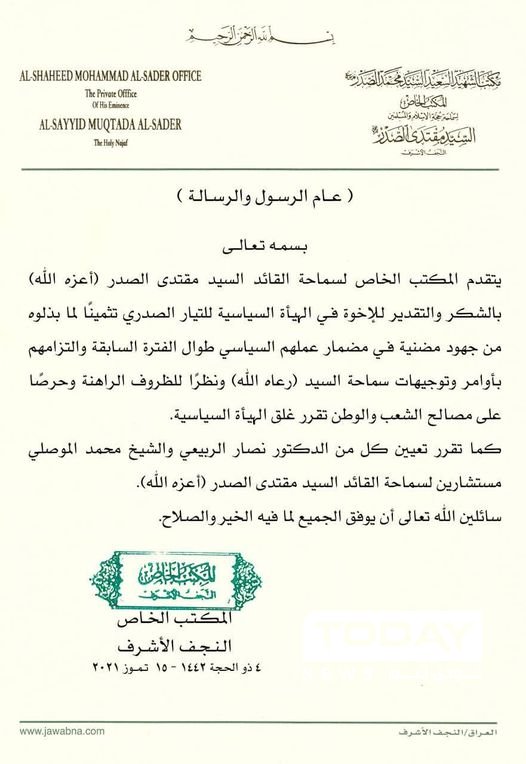 بالوثيقة.. مكتب الصدر يصدر قرارا بغلق الهيئة السياسية