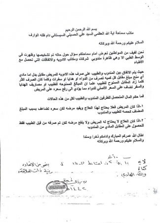 أصدر المرجع الأعلى السيد علي السيستاني (دام ظله)، الاثنين، استفتاءً جديداً بشأن “أسعار الأدوية” ومخالفة القواعد والتعليمات القانونية.