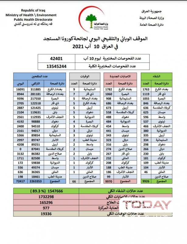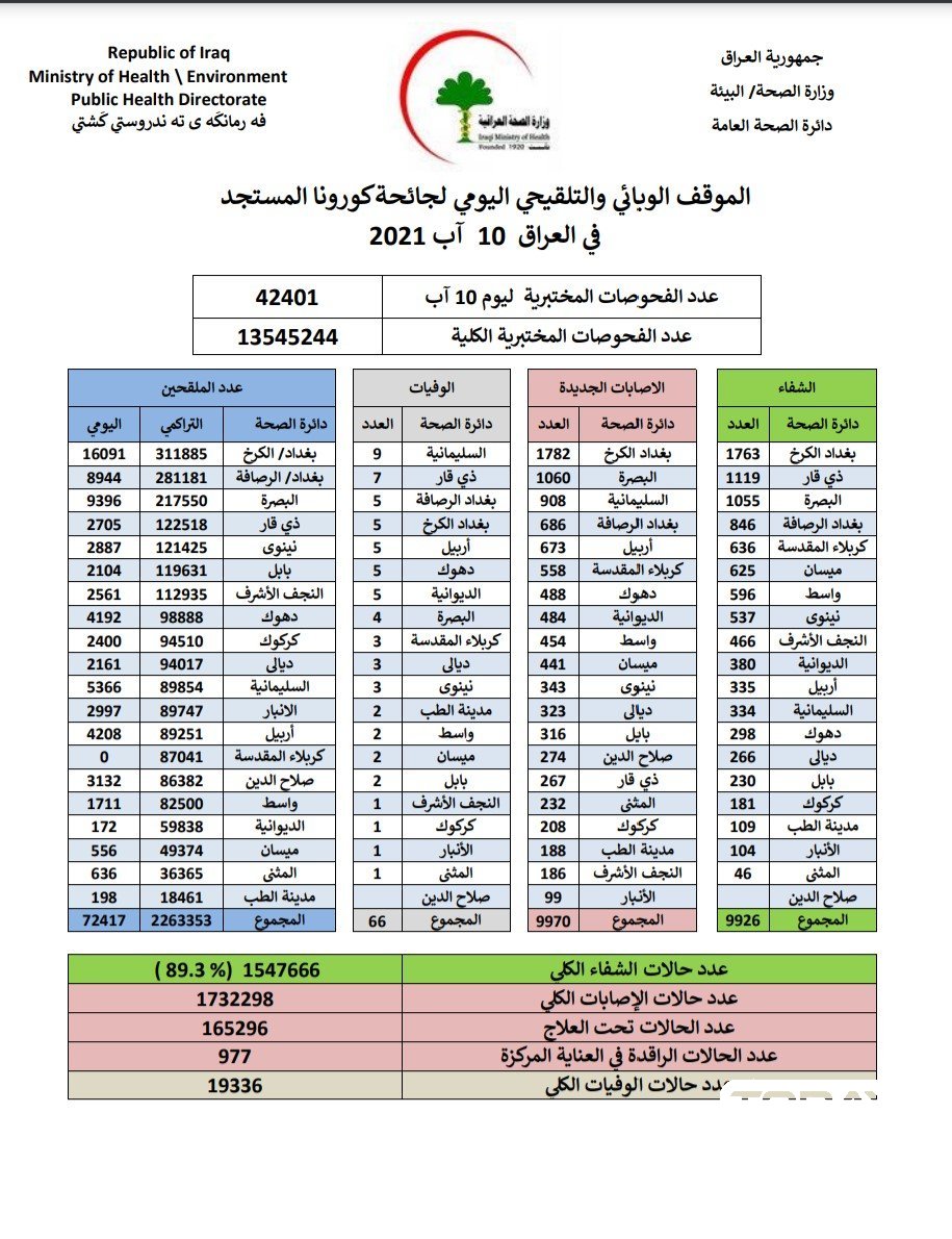 وأضاف البيان، أن "حالات الوفاة الجديدة بكورونا بلغت 66 حالة في عموم محافظات البلاد"، لافتا إلى أن "الاشخاص الذين تلقوا اللقاح خلال 24 ساعة بلغ عددهم 72417".