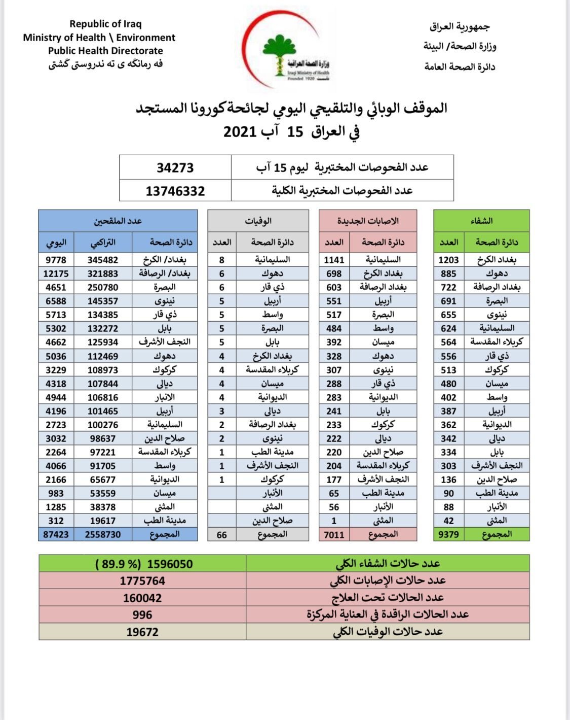 وأضاف البيان، أن "حالات الوفاة الجديدة بكورونا بلغت 66 حالة في عموم محافظات البلاد"، لافتا إلى أن "الاشخاص الذين تلقوا اللقاح خلال 24 ساعة بلغ عددهم 87423".